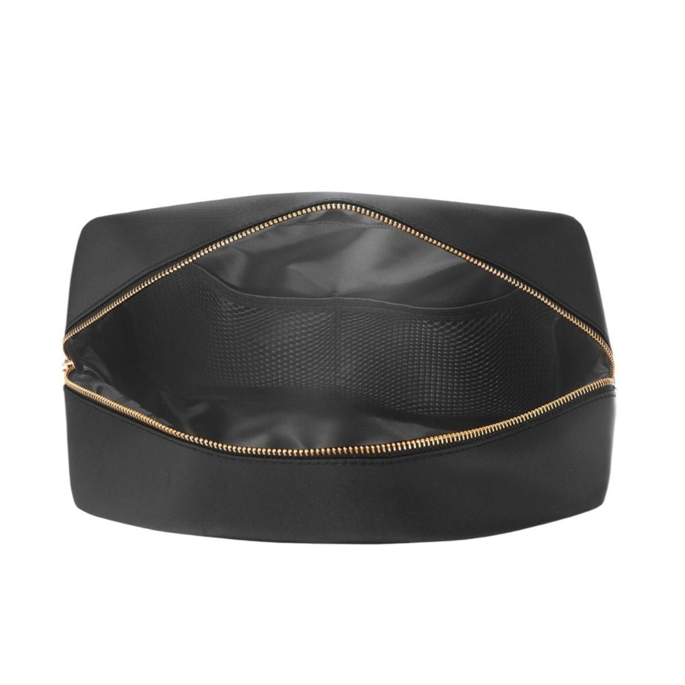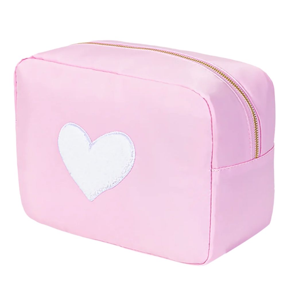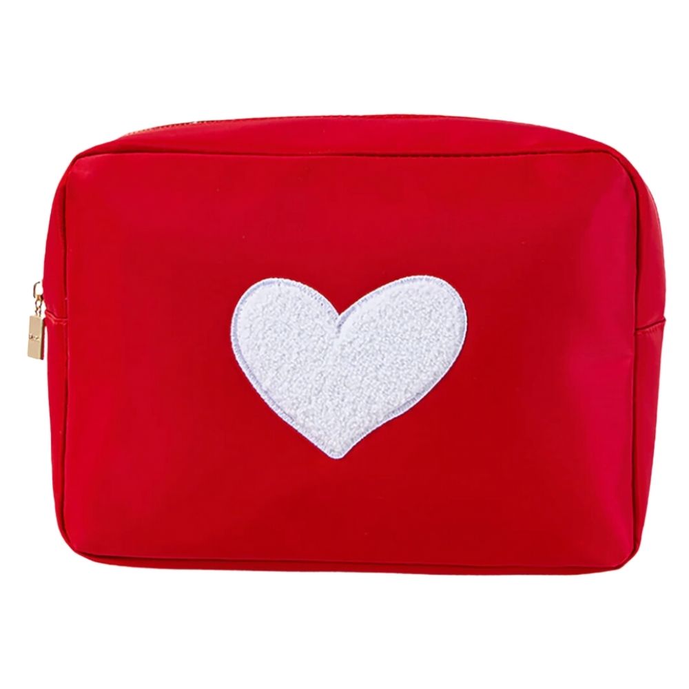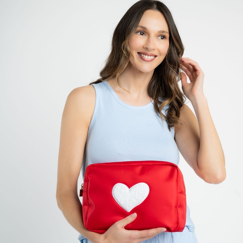 An extra-large nylon bag featuring a darling chenille heart patch on the front. This bag helps keep cosmetics and skincare essentials lovingly secured when at home and on the go. It’s designed with a convenient top zip closure and interior pockets for easy organizing.