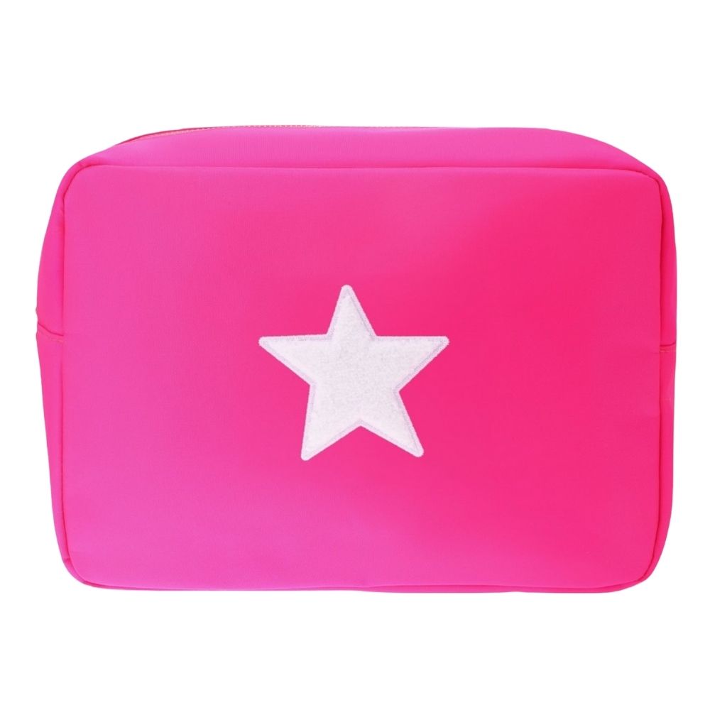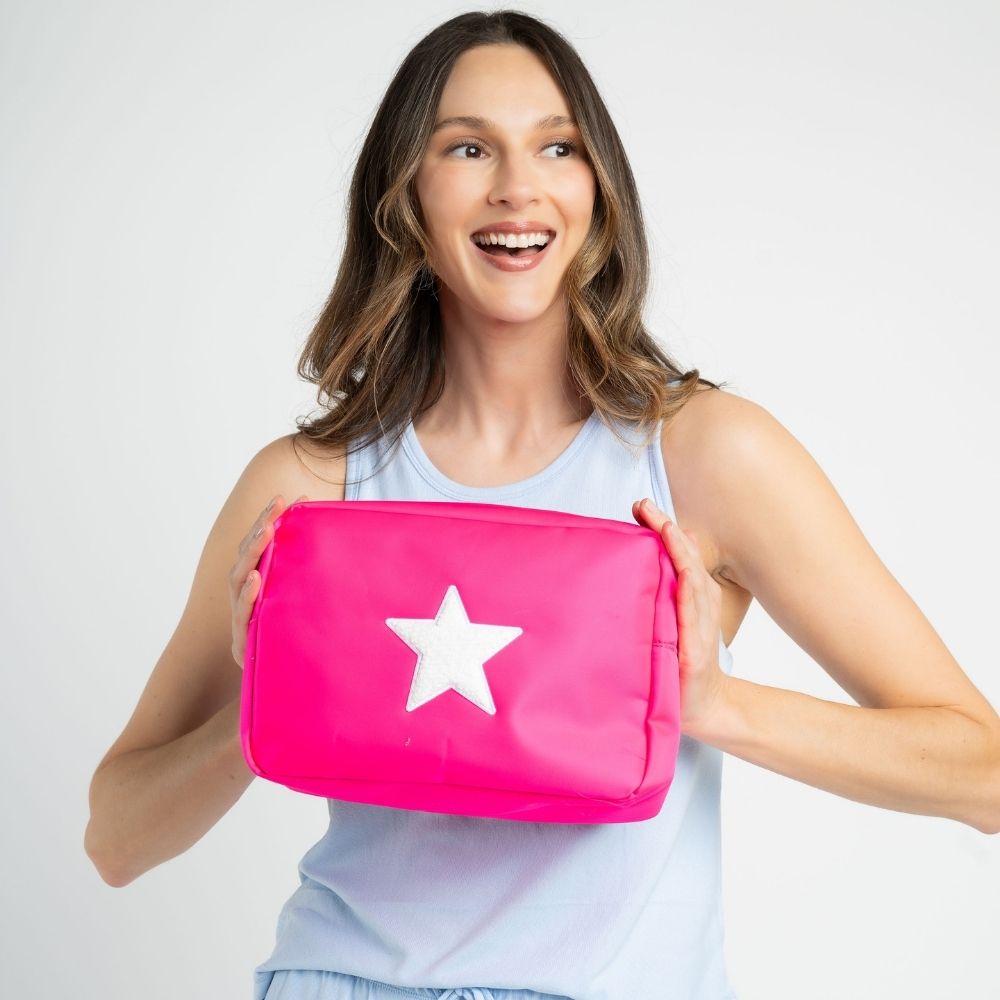 An extra-large nylon bag featuring a darling star appliqué and gleaming hardware. This bag helps keep cosmetics and skincare essentials lovingly secured when at home and on the go. It's designed with a convenient top zip closure and interior pockets for easy organizing.