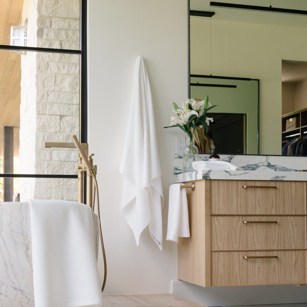 Bring a touch of timeless texture into your bathroom with these Waffle Bath Sheets. Larger than a standard bath towel, each reversible bath sheet features a mini textured waffle weave on one side and ribbed terry on the other.