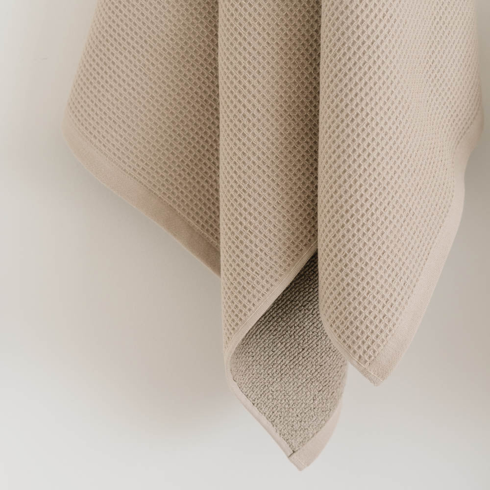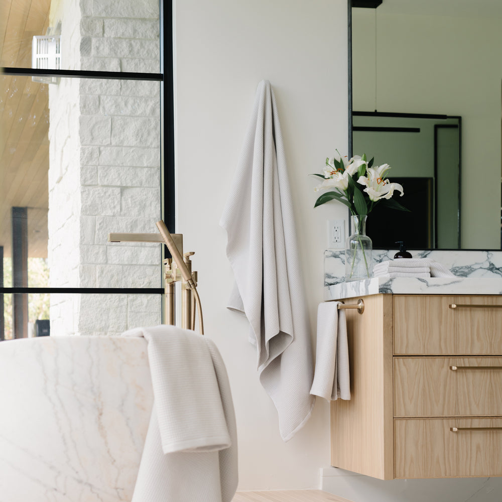 The dual-sided Waffle Bath Towels balance the modern texture of a mini waffle weave with the plush softness of ribbed terry. Awaken your bathroom aesthetic with the decorative waffle side, while drying off with the lightweight yet ultra-absorbent terry.