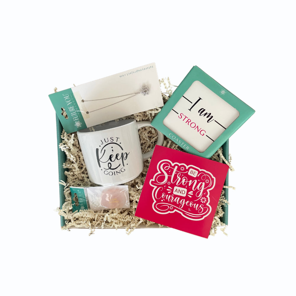 The Stay Strong Gift Box includes five inspirational gifts, along with a personalized letter from the recipient's future self, reminding them that they are never alone and brighter days are ahead.