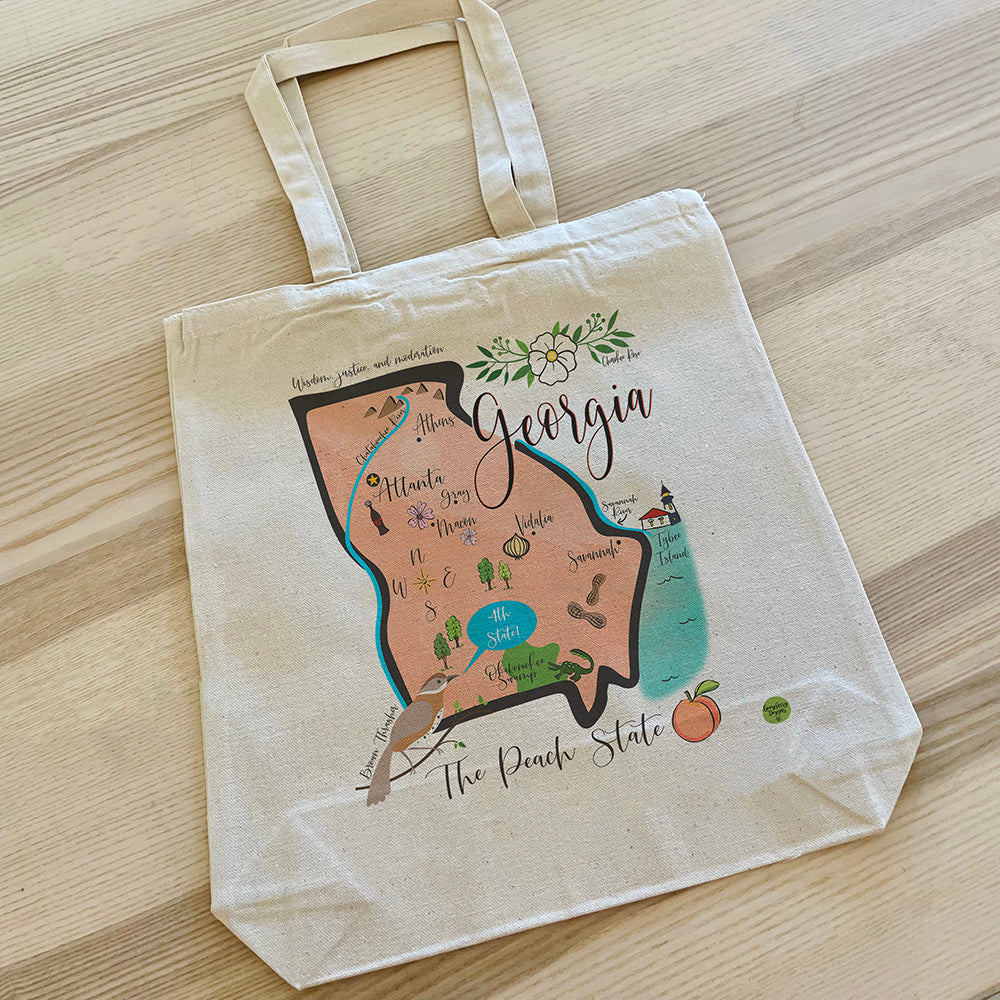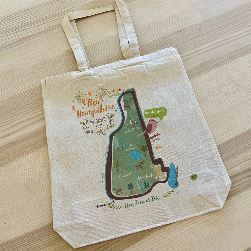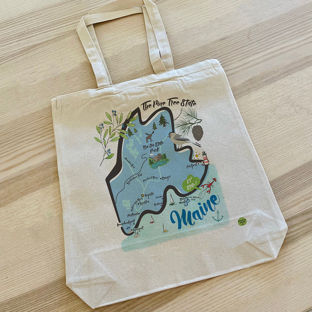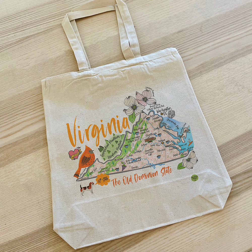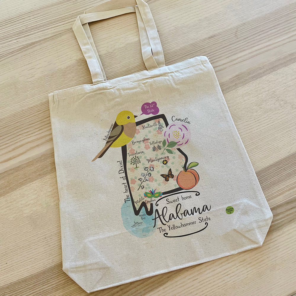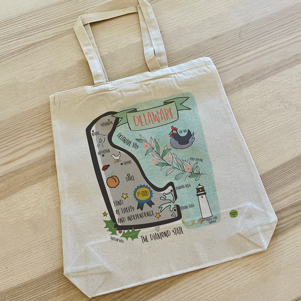Featuring a signature, hand-drawn, calligraphic state design, this stylish tote is made of 100% organic, natural cotton. It’s ideal for commemorating a memorable vacation, and works wonderfully as a wedding or party favor, corporate gift, or welcome bag.