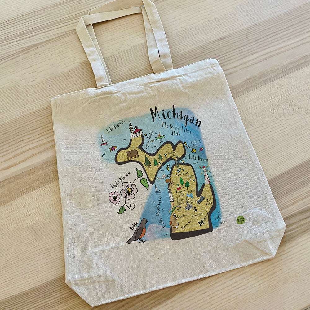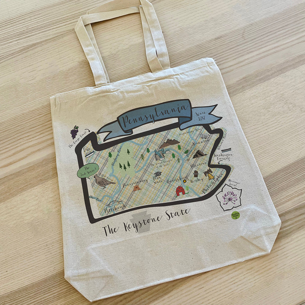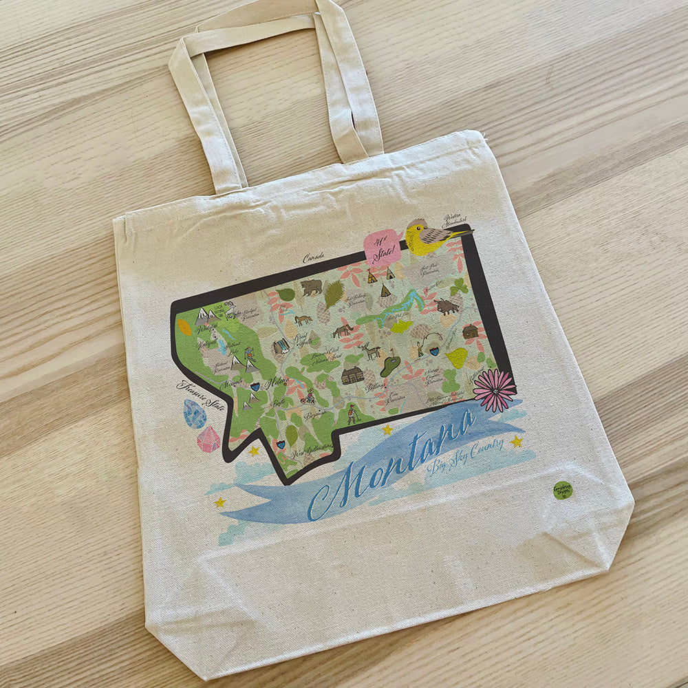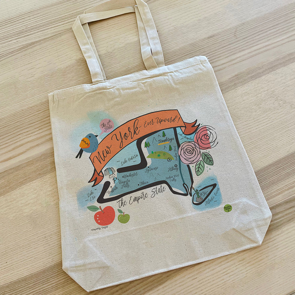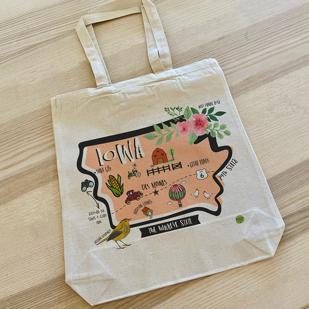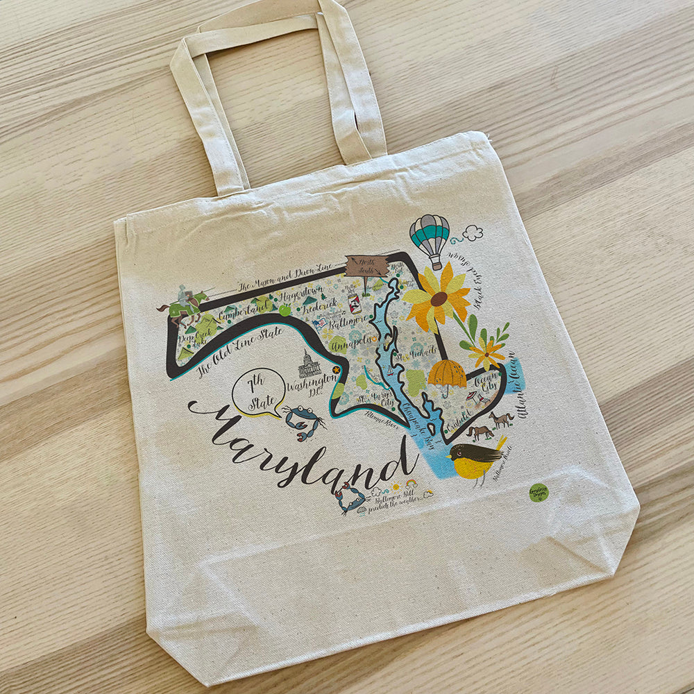 Featuring a signature, hand-drawn, calligraphic state design, this stylish tote is made of 100% organic, natural cotton. It’s ideal for commemorating a memorable vacation, and works wonderfully as a wedding or party favor, corporate gift, or welcome bag.