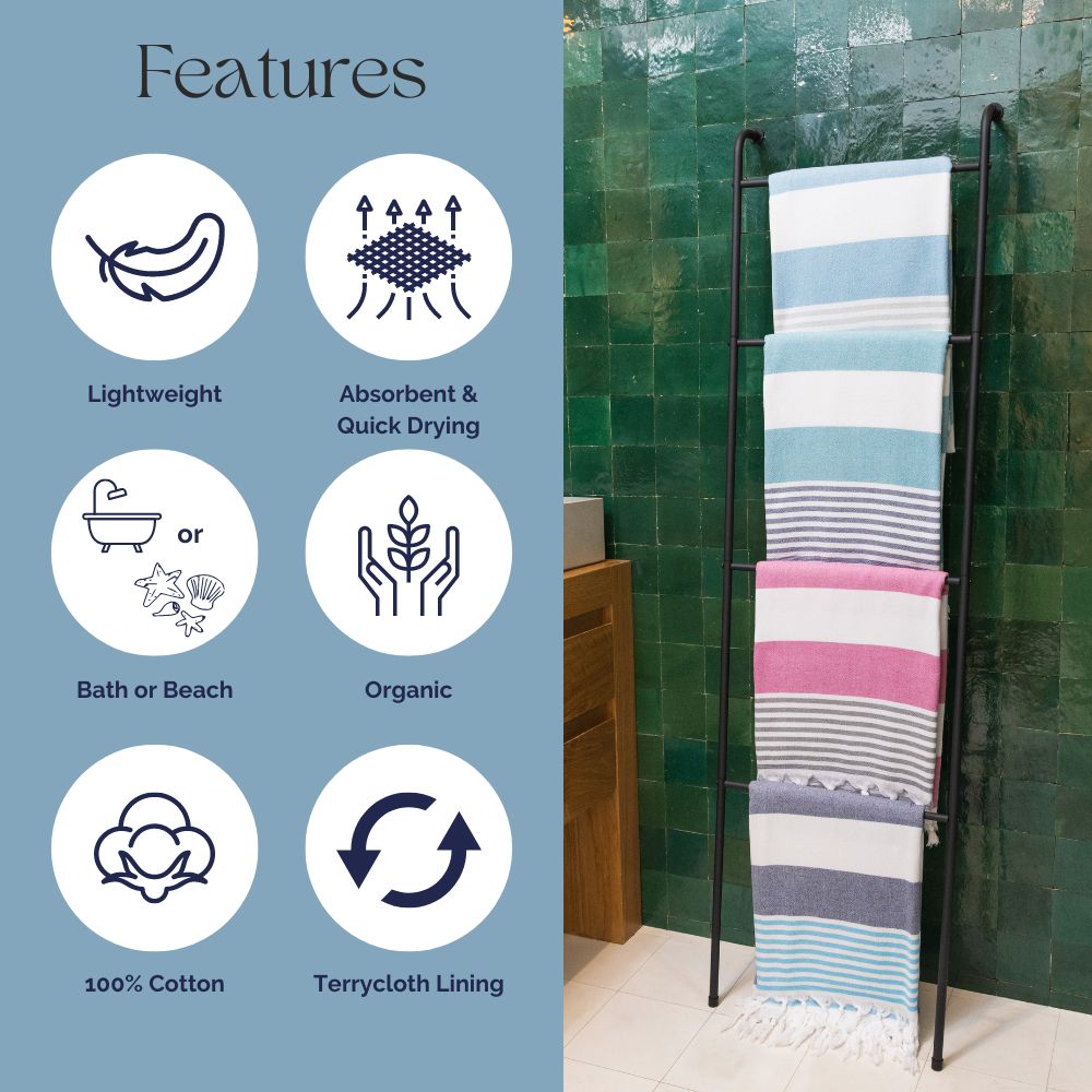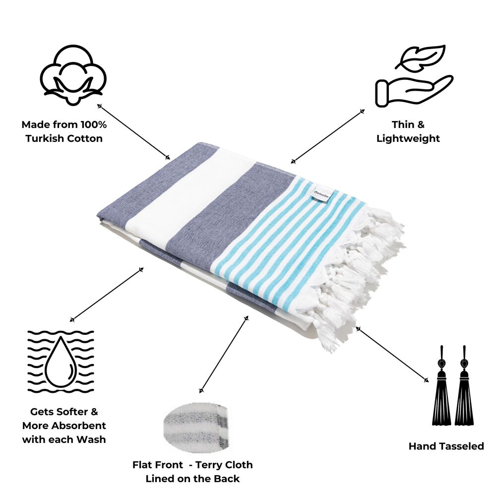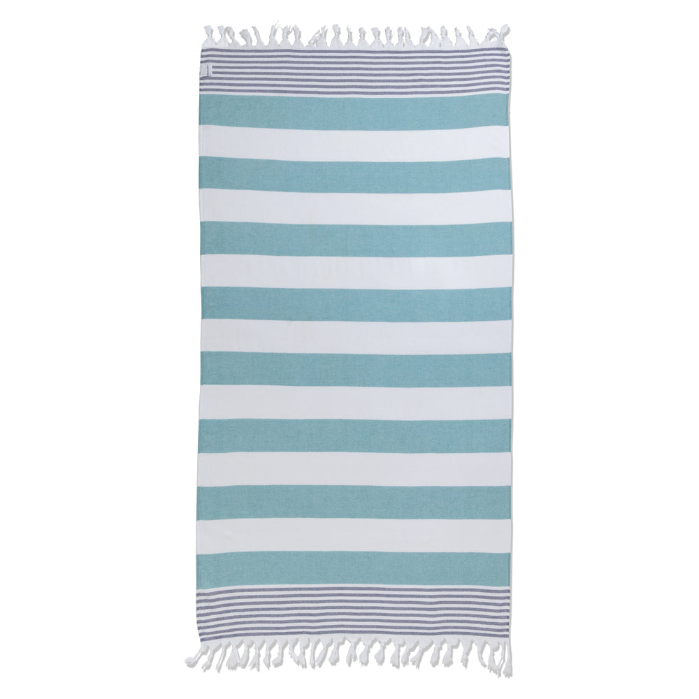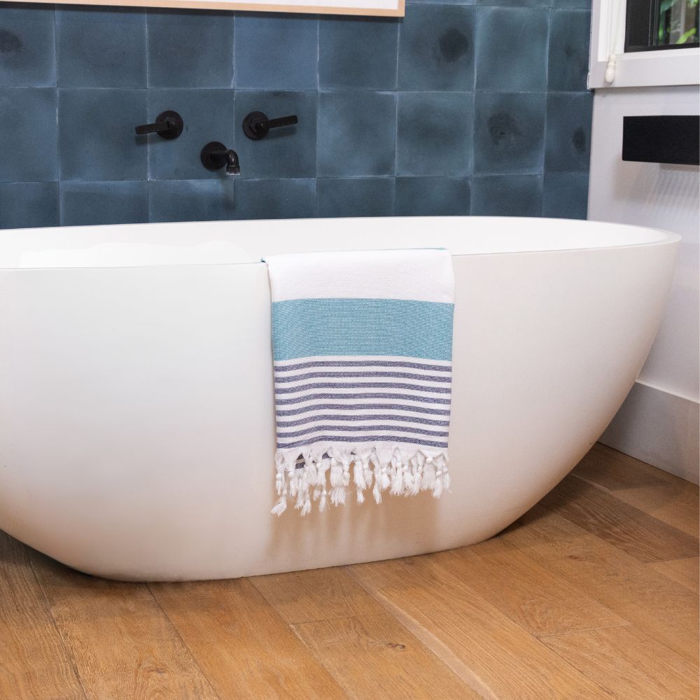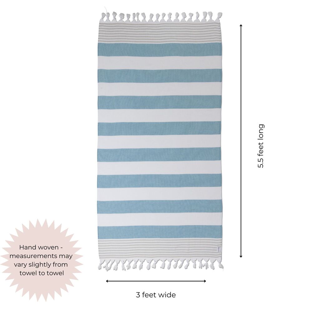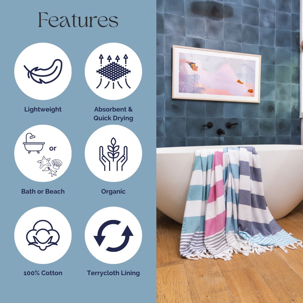 The ideal blend of tradition and comfort, the Marine Turkish Towel features a stylish striped flat-weave front and a soft terry cloth backing. This dual-textured towel brings together the lightweight, quick-drying properties of a classic Turkish towel with the cozy, absorbent qualities of terry cloth. Ideal for everyday luxury, this versatile towel is designed to offer durability and style, whether as a bath towel in your home, at the beach or pool, or on your next adventure!