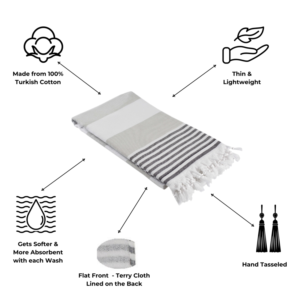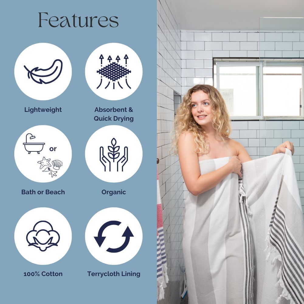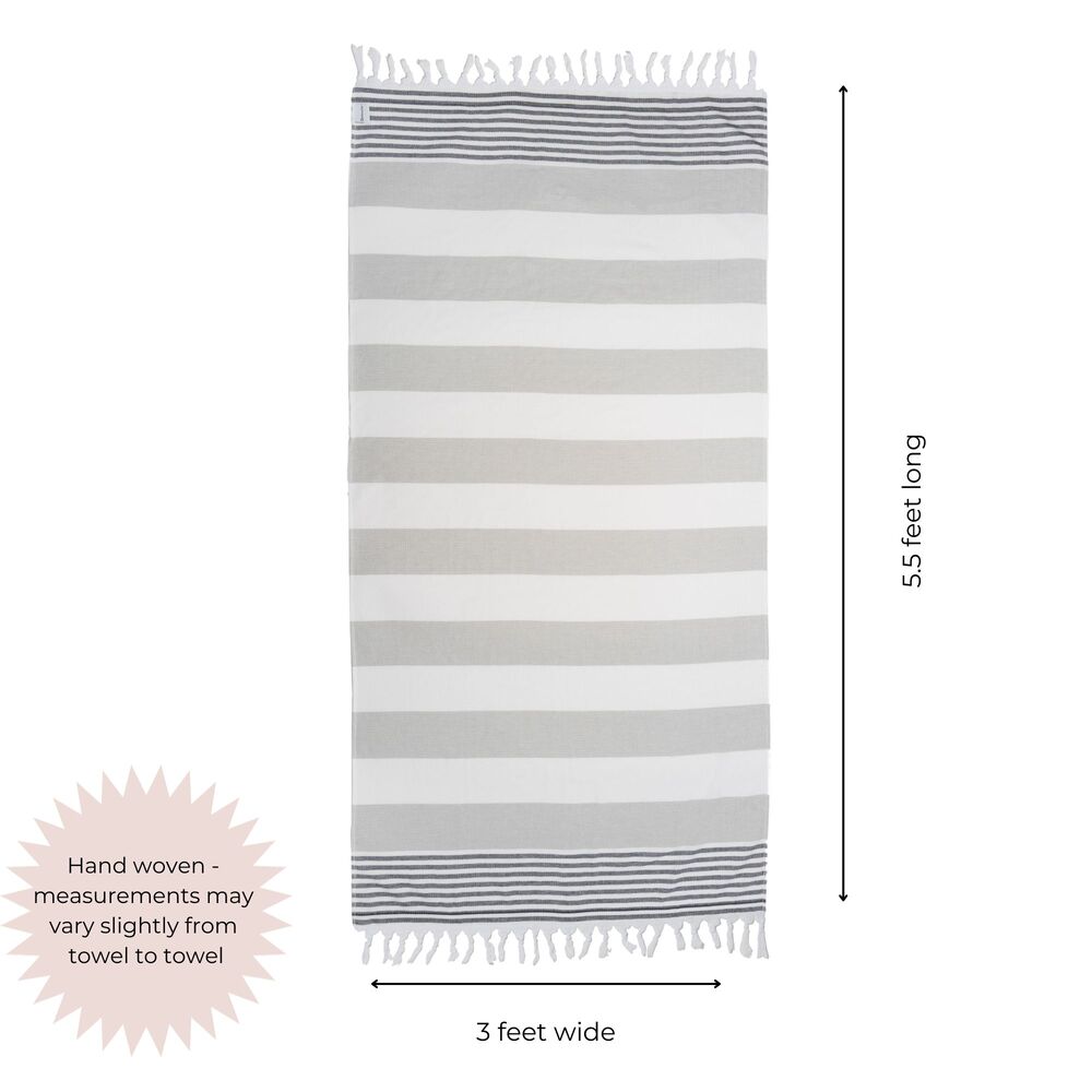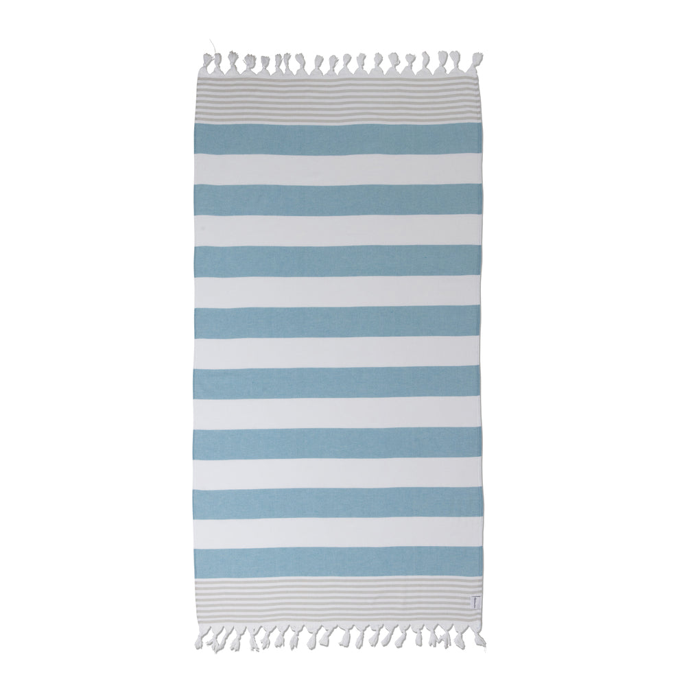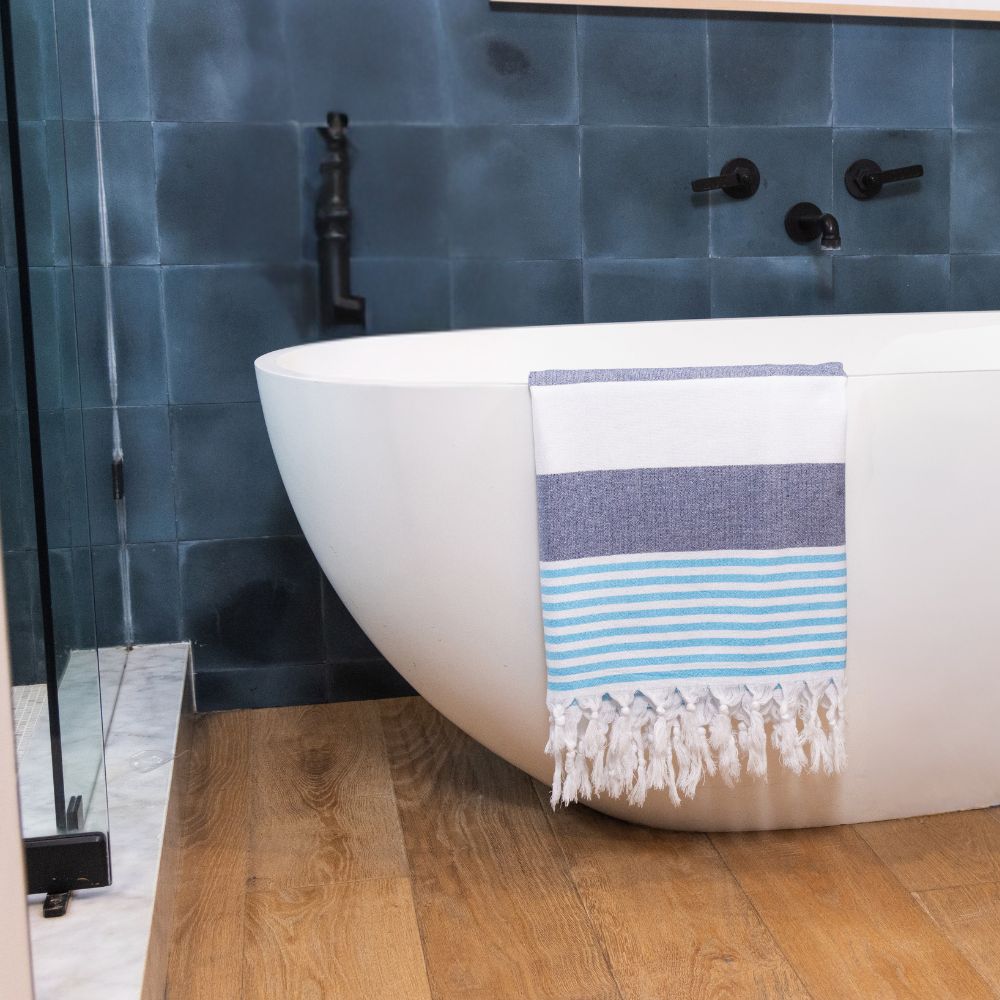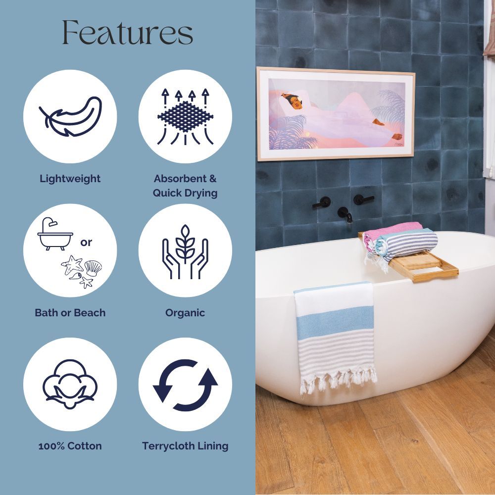 The ideal blend of tradition and comfort, the Marine Turkish Towel features a stylish striped flat-weave front and a soft terry cloth backing. This dual-textured towel brings together the lightweight, quick-drying properties of a classic Turkish towel with the cozy, absorbent qualities of terry cloth. Ideal for everyday luxury, this versatile towel is designed to offer durability and style, whether as a bath towel in your home, at the beach or pool, or on your next adventure!