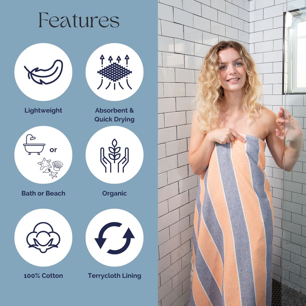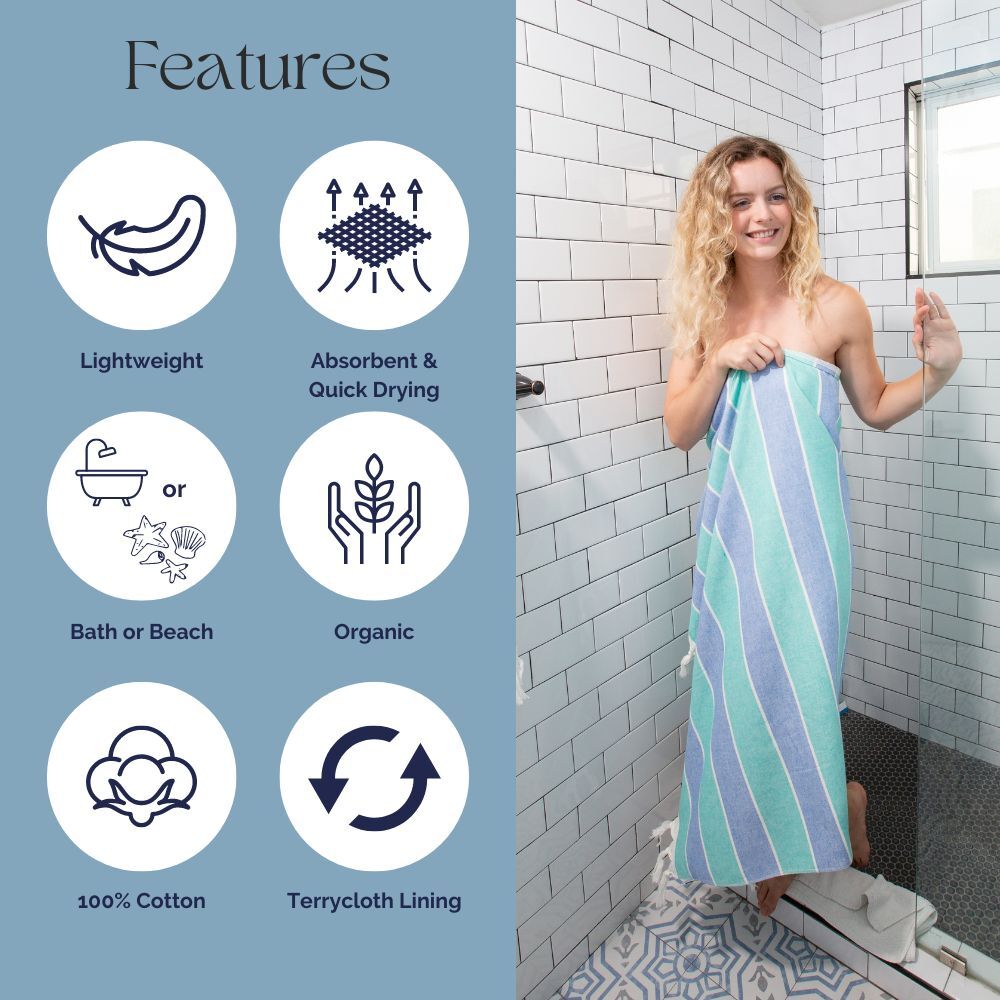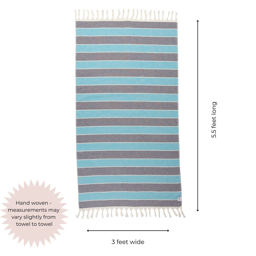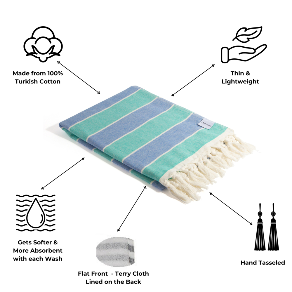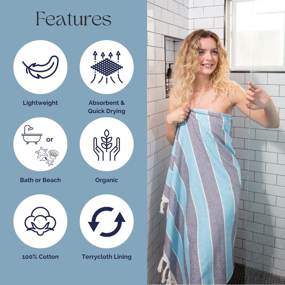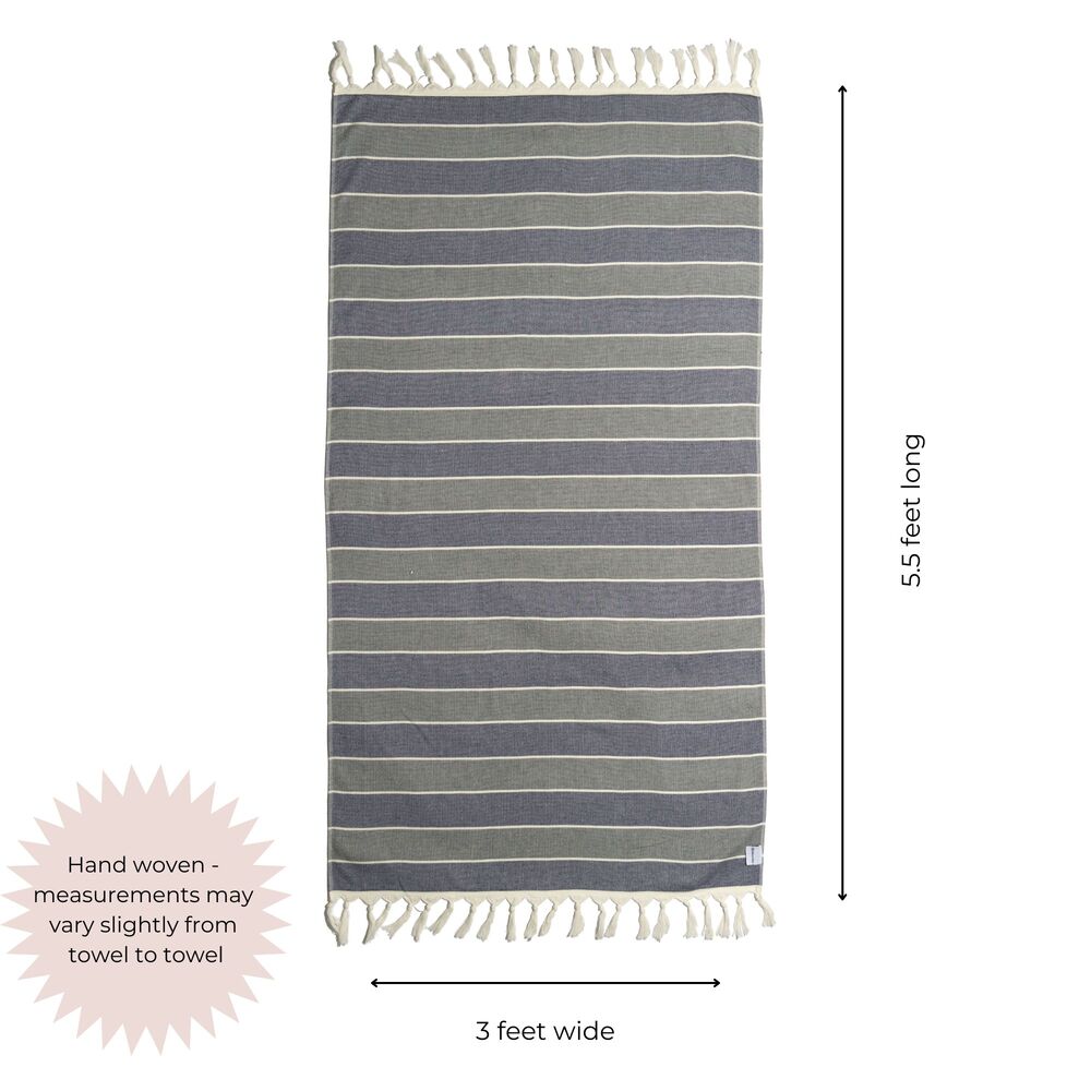 The ideal blend of tradition and comfort, the Multi-Striped Turkish Towel features a stylish striped flat-weave front and a soft terry cloth backing. This dual-textured towel brings together the lightweight, quick-drying properties of a classic Turkish towel with the cozy, absorbent qualities of terry cloth. Great for everyday luxury, this versatile towel is designed to offer durability and style, whether as a bath towel in your home, at the beach or pool, or on your next adventure!