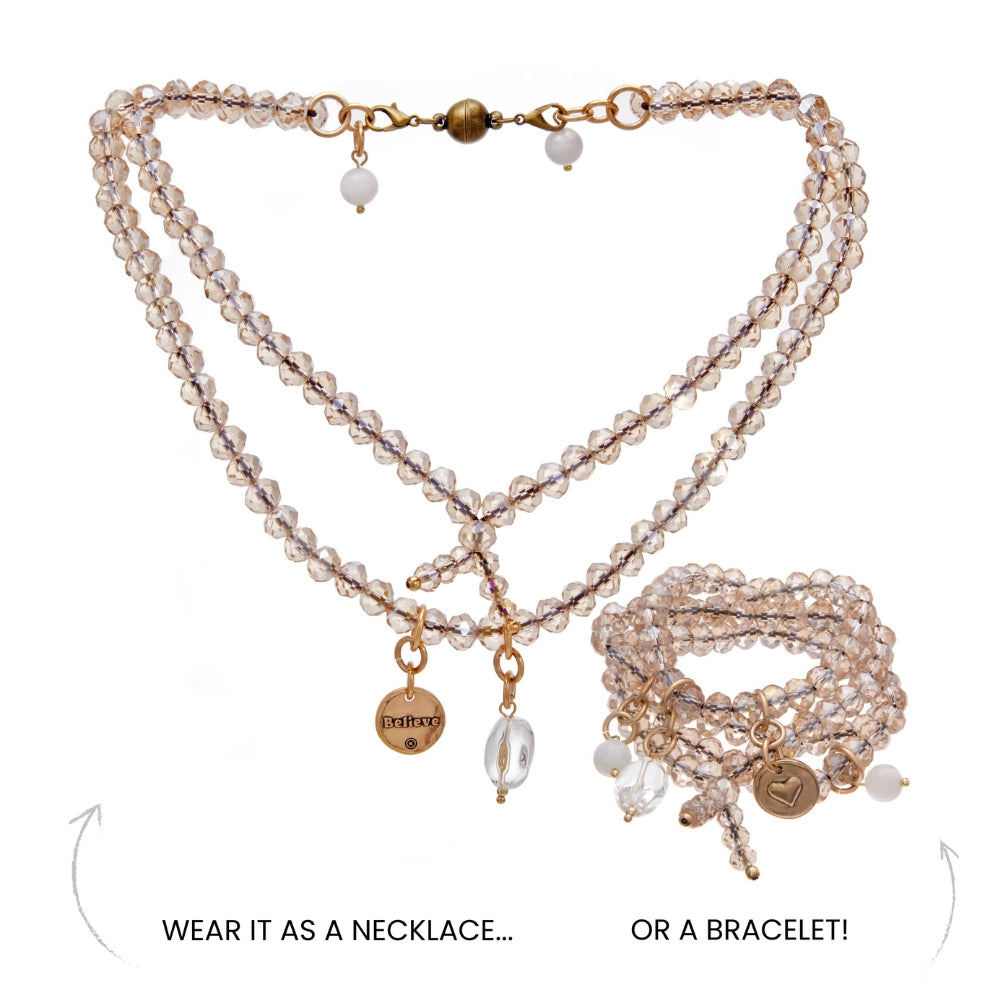 The Believe Heart Crystal Boho Wrap blends faceted beige crystals, moonstone, and crystal quartz accents, and a gold-finish heart pendant into a versatile wrap you can wear as a bracelet or necklace with its magnetic clasp.