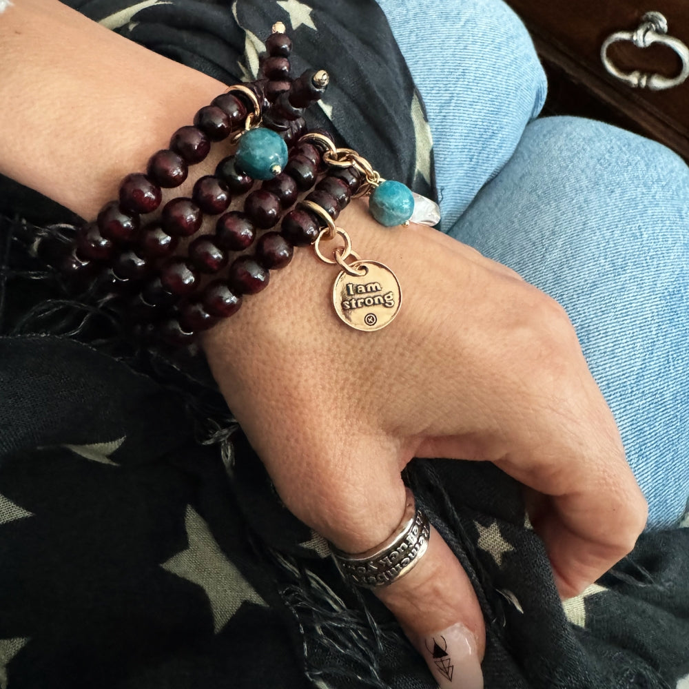 The I Am Strong Heart Wood Boho Wrap blends red wooden beads with a crystal quartz heart, apatite accents, and a gold finish pendant. The magnetic clasp allows you to wrap it as a necklace or bracelet, and carry strength with every wear.