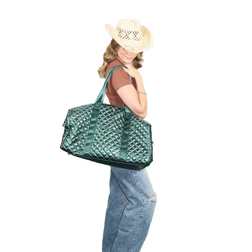 Elevate your travel experience with the Debra Diamond Weekender Bag, designed for modern travelers who value style and function. Ideal for weekend getaways or longer adventures, it keeps your essentials organized and easy to access. Use it as a tote, fold and snap it into a chic duffel, carry it with the shoulder handles, or use the adjustable crossbody strap.