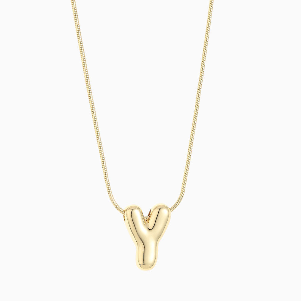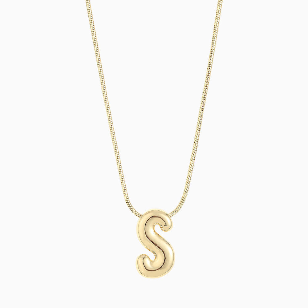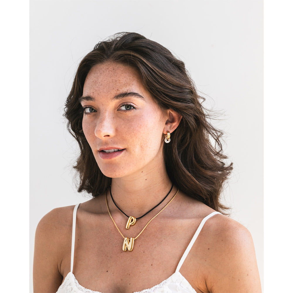 Make a bold statement with the Large Balloon Initial Necklace, crafted from 18K gold-plated brass. This piece features an interchangeable black cord and gold snake chain, both complete with extenders for versatility. Whether worn solo or layered, this necklace easily adapts to your style. It’s the ideal addition for adding a touch of personalization to any look.