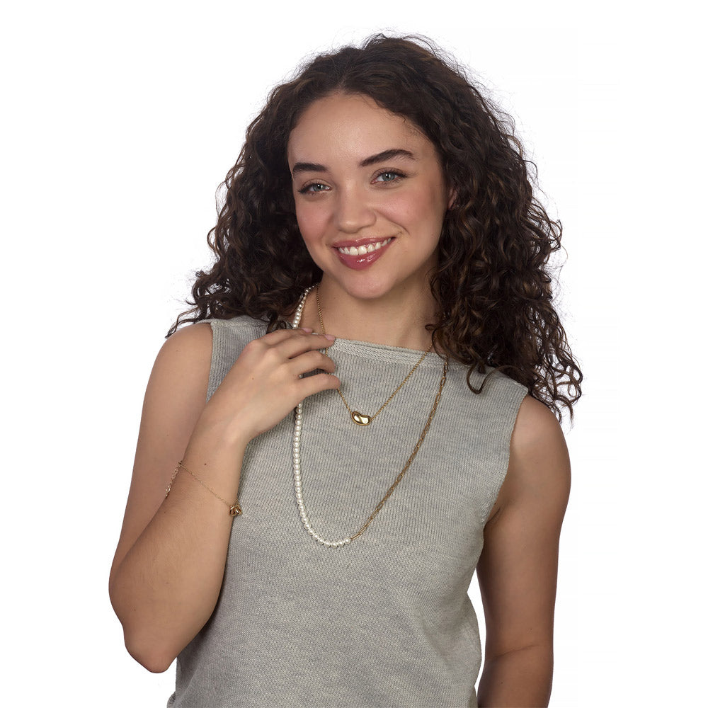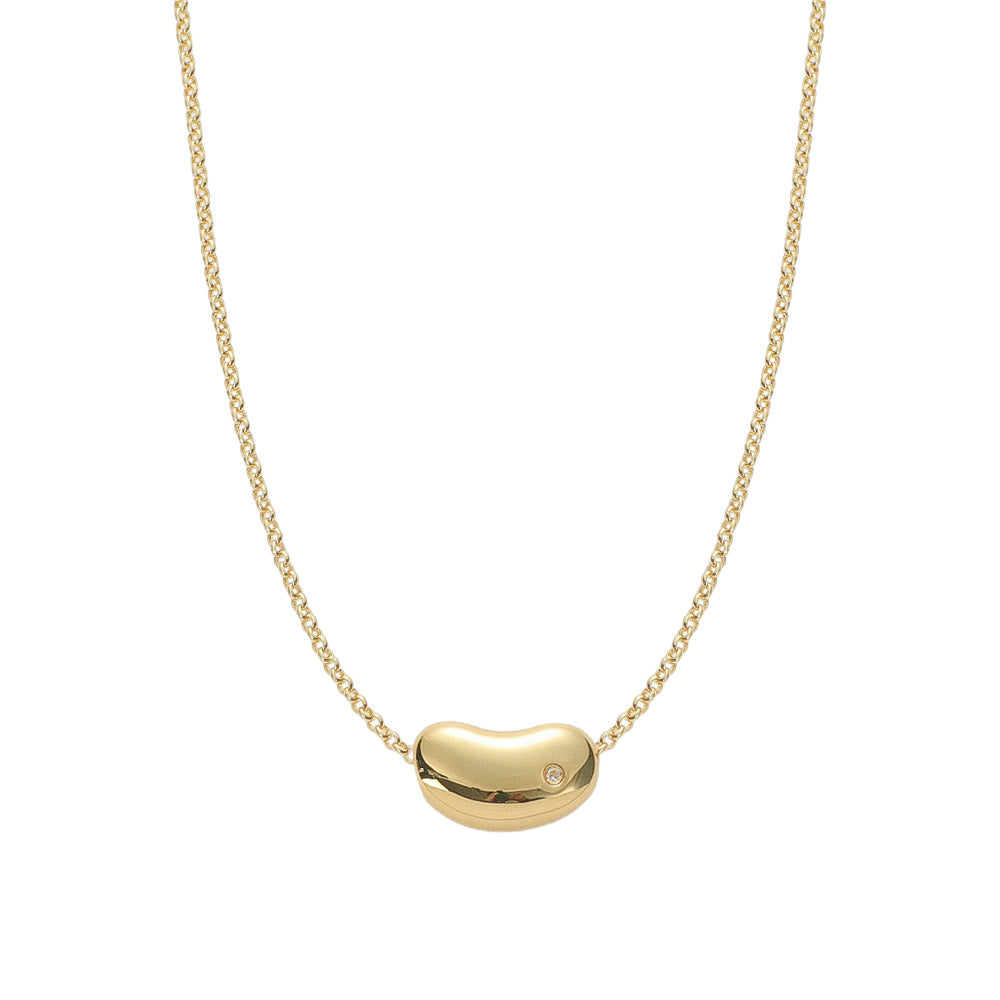 The Moonbean Necklace is a romantic blend of elegance and charm, featuring an oblong bean with an off-center stone on a delicate rolo chain—a modern, yet timeless piece.