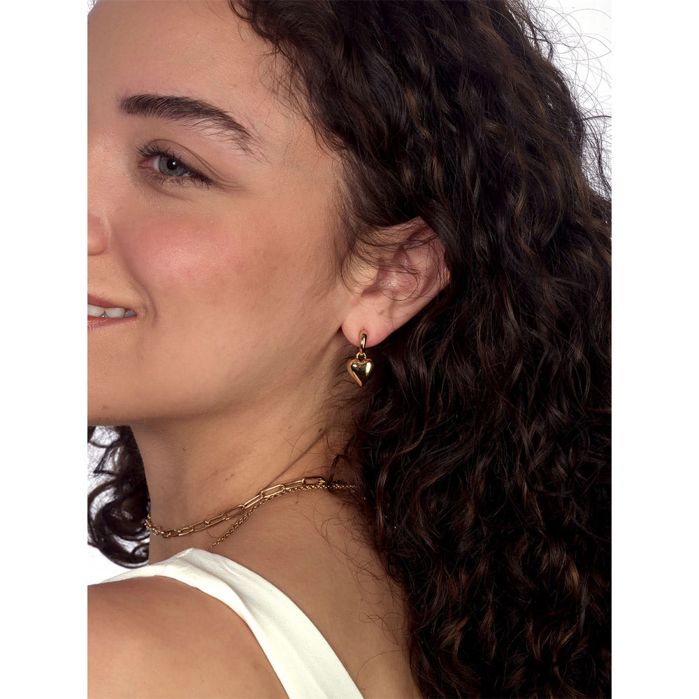 The Sweetheart Dangle Earrings are chic, gold-plated huggies with a playful heart drop—flirty, modern, and effortlessly cool.