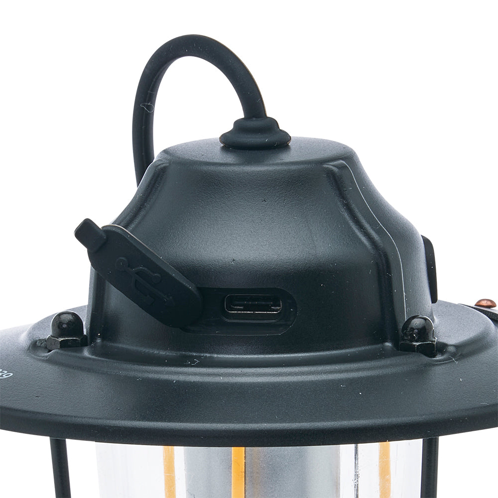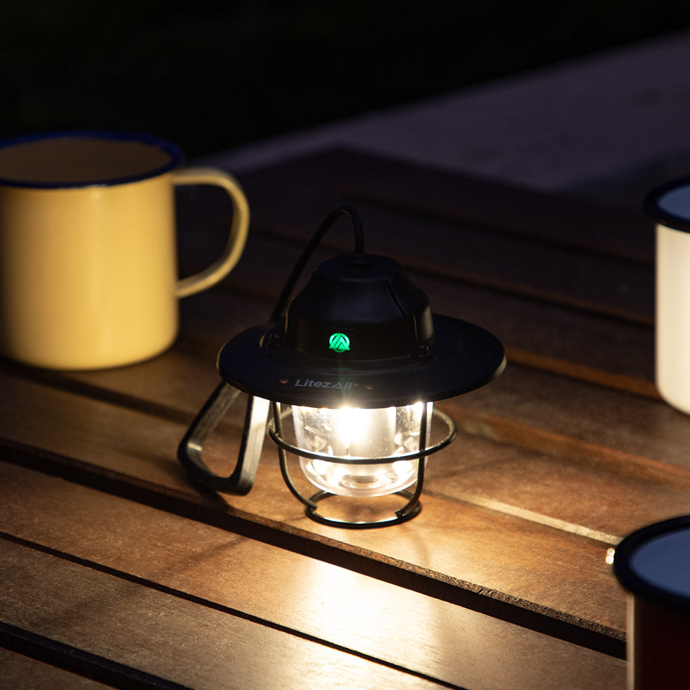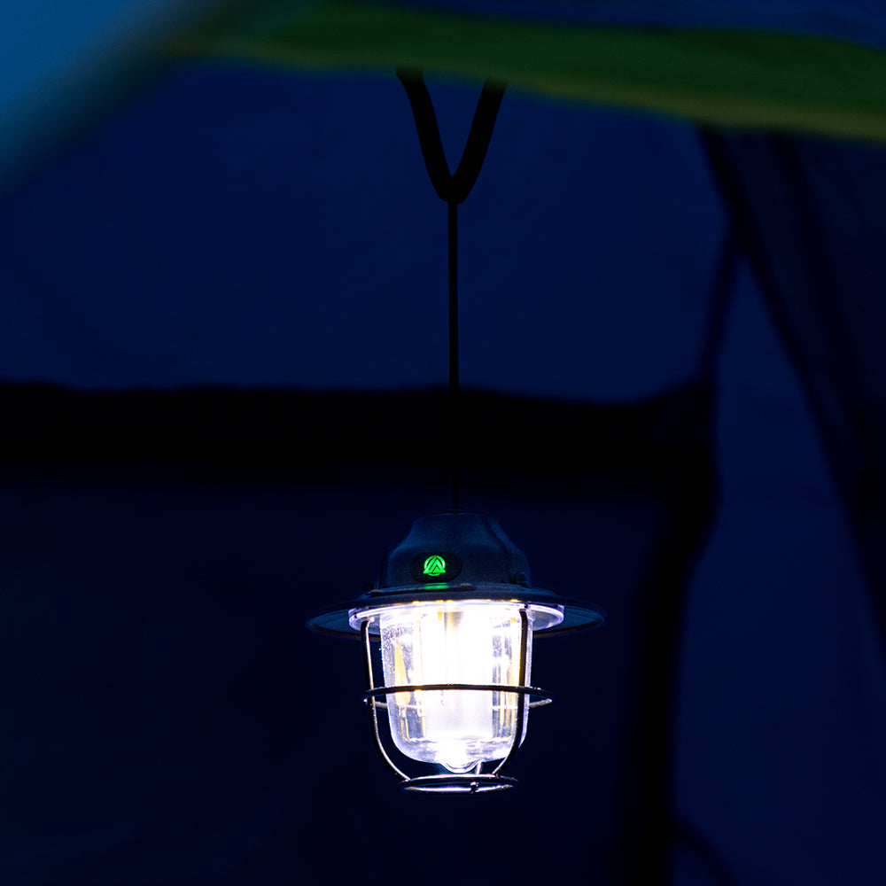 A retro-style, rechargeable compact lantern with warm white and bright white options. Four light modes include three static and one that fades slowly between warm and white light. Static light modes include warm white only, white light only, and combined warm and white light.