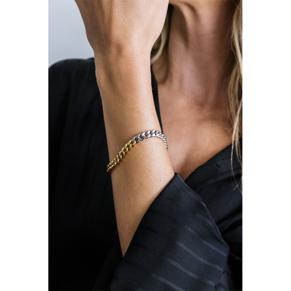Featuring a blend of gold and silver, this mixed metal Cuban link chain bracelet creates a bold and contemporary look. Its durable construction and eye-catching design make it the ideal statement piece to elevate any style.
