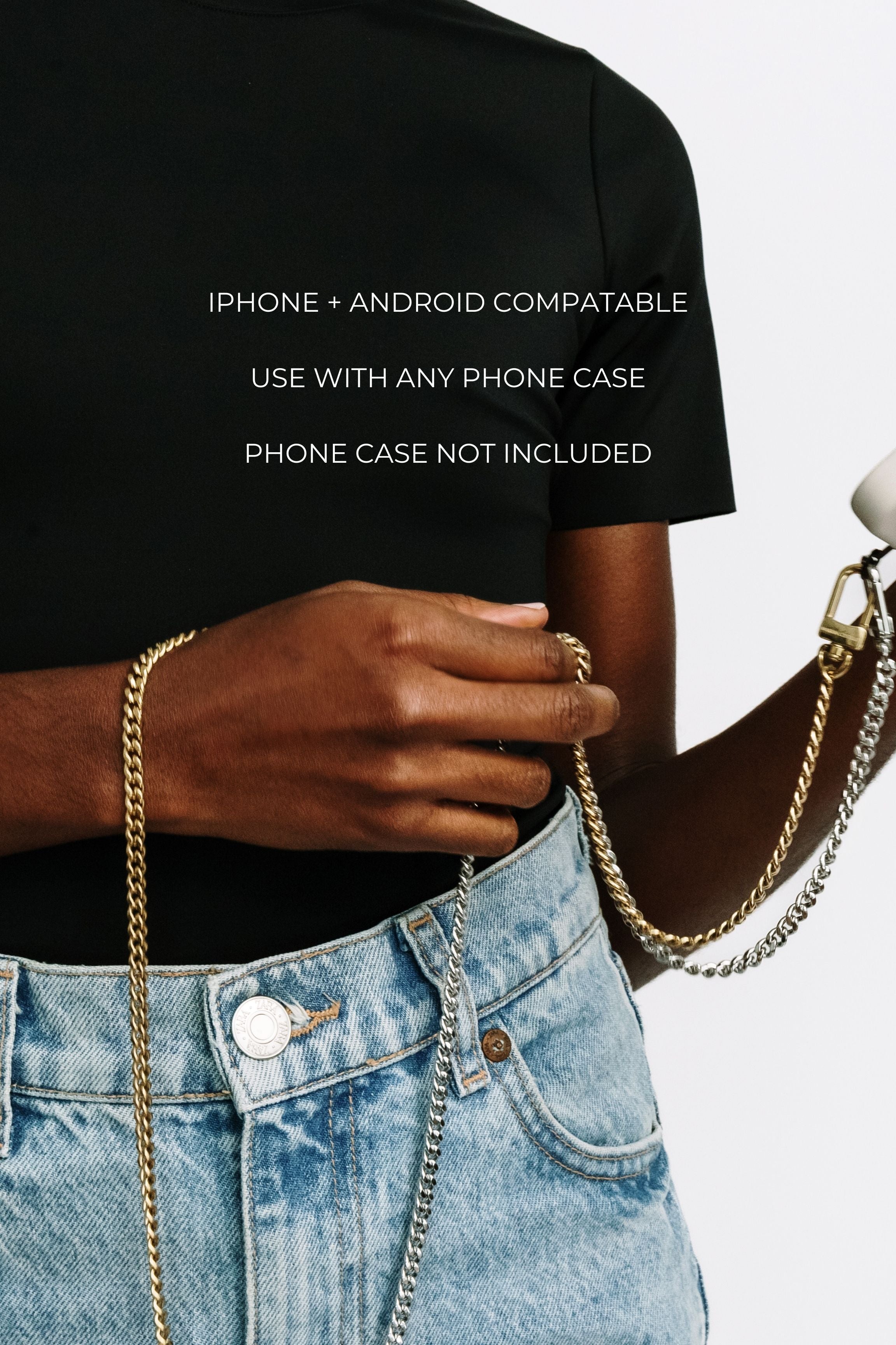 Elevate your everyday essentials with this iconic phone chain, crafted from durable and waterproof stainless steel Cuban links. Featuring double lock signature clasp hardware and a universal phone insert, this versatile piece doubles as a stunning multi-layered necklace or purse chain, blending fashion with practicality.