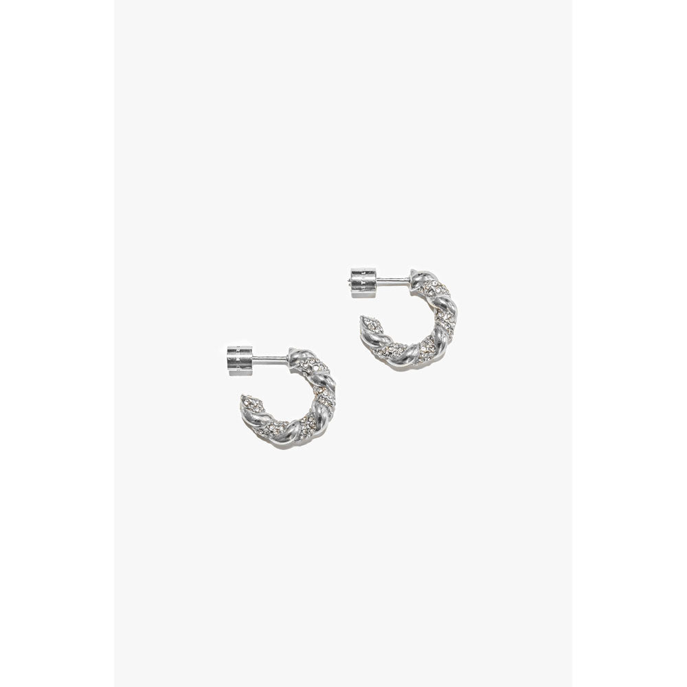 A modern take on a vintage aesthetic—the Rita Pavé Hoops blend trendy and timeless into an earring style you're sure to have forever and ever. A twisted, croissant-style hoop earring with simulated diamond detail. These post hoops are accompanied by custom earring backings.