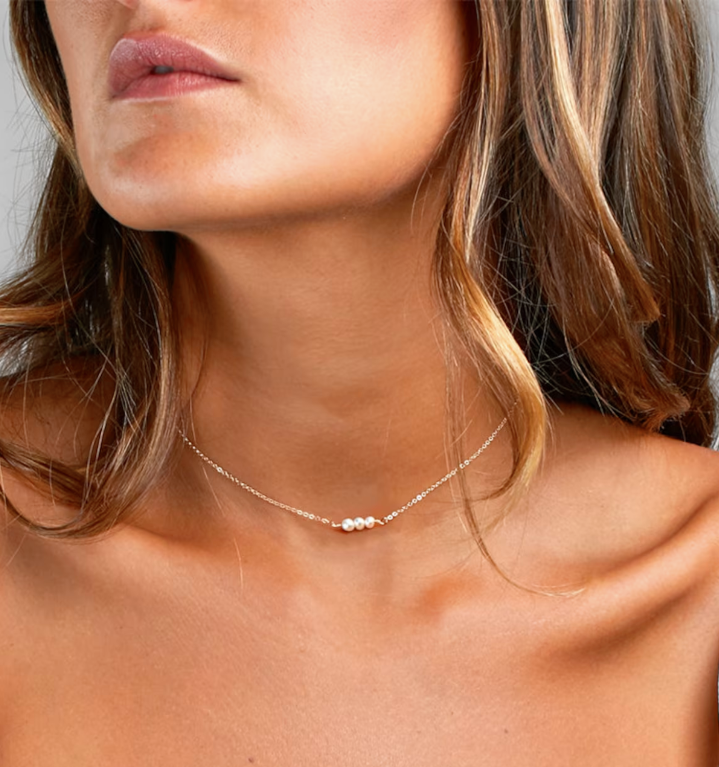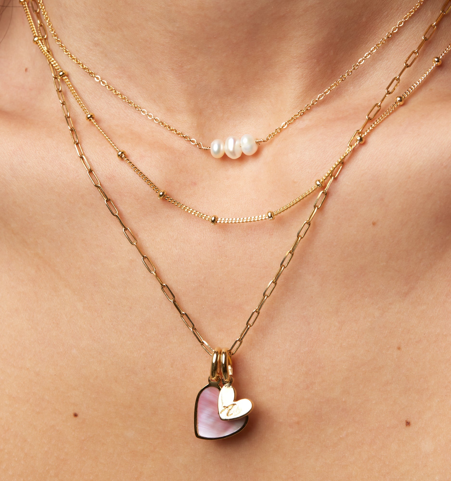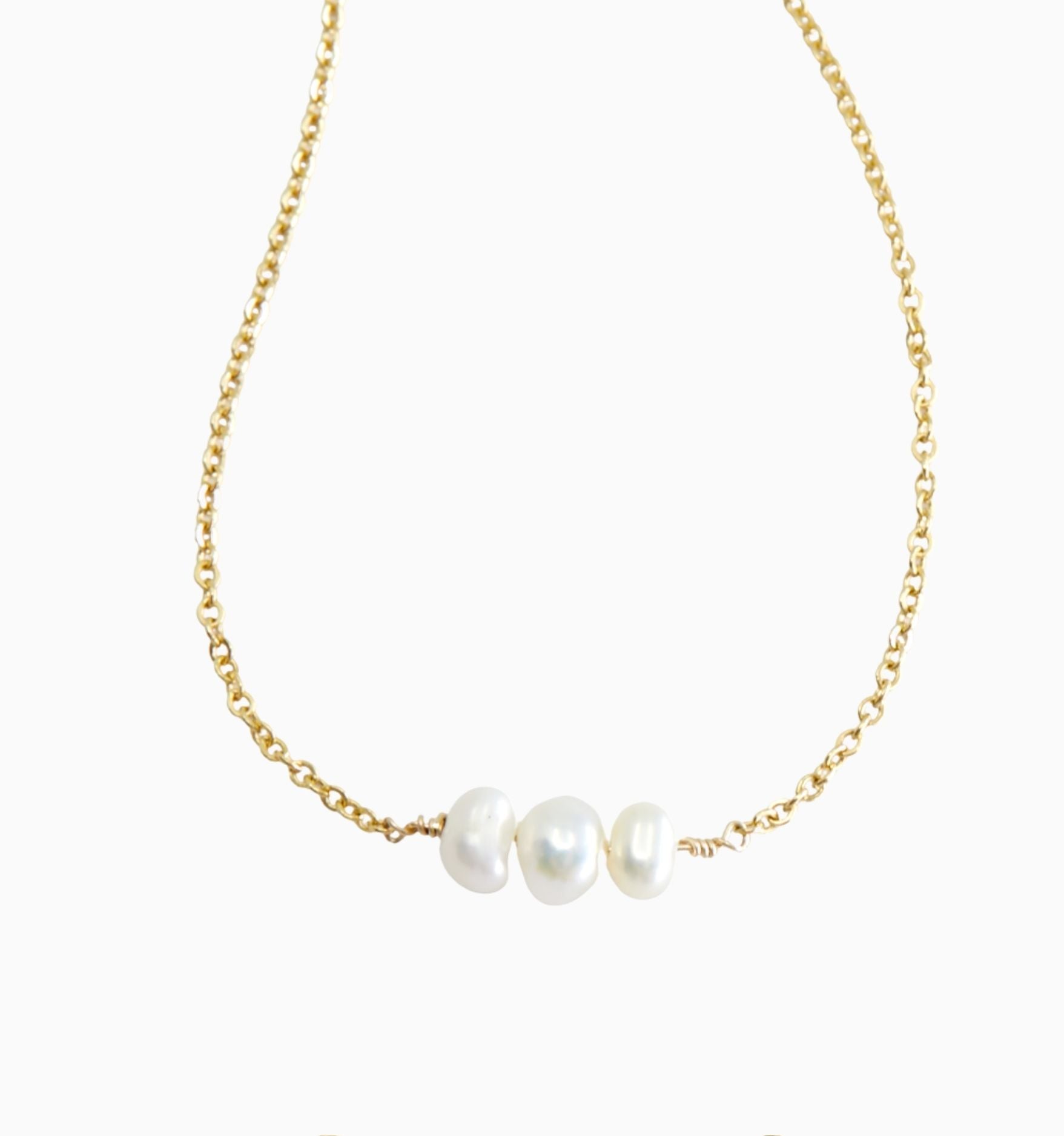 Three petite freshwater pearls float along this dainty gold chain, adding a whisper of glow to any stack. Wear it snug at 15” for a true choker vibe or let it fall to 17” to skim your collarbone. Either way, the pearls lend effortless polish to this everyday necklace that you can keep on through showers, workouts, and every outfit change.