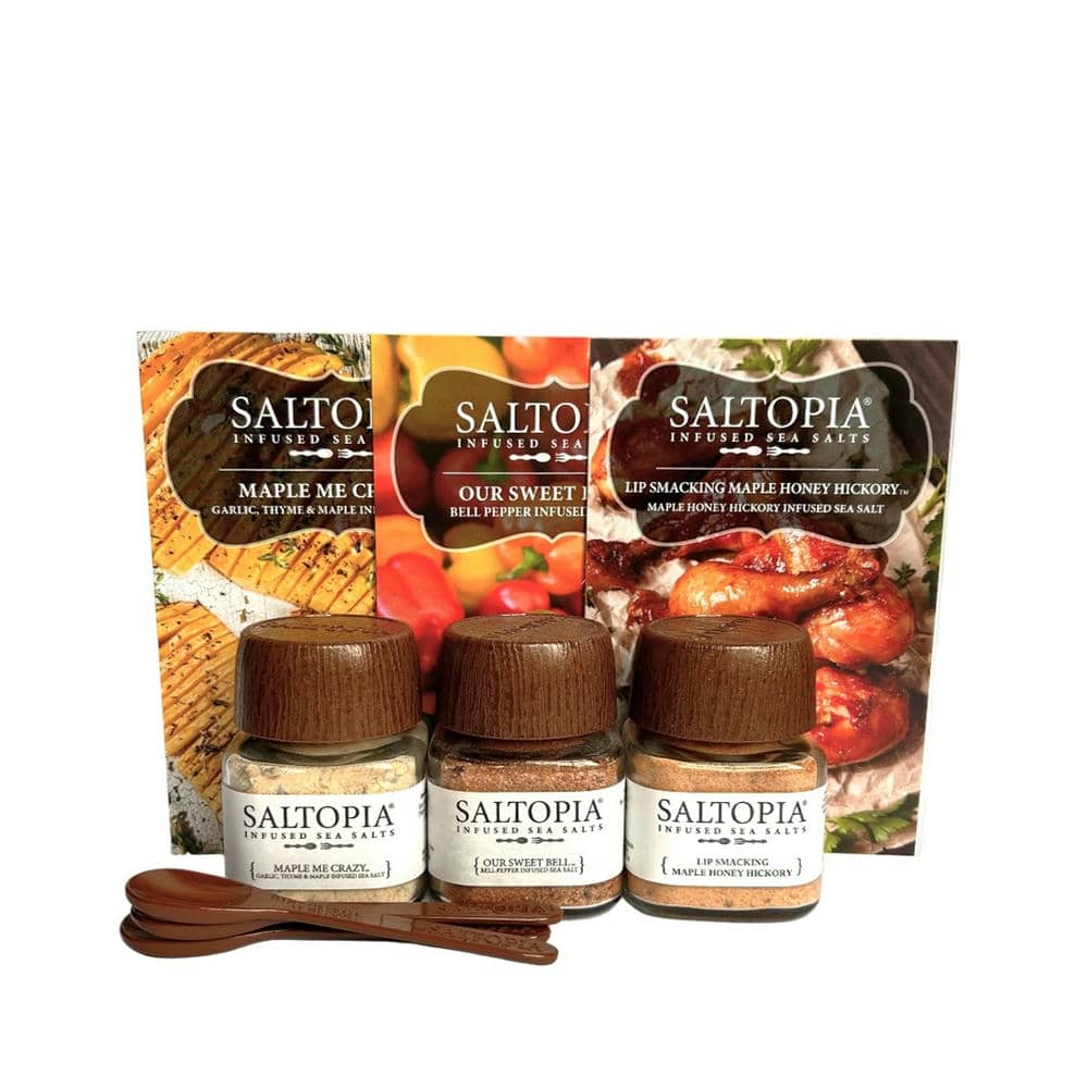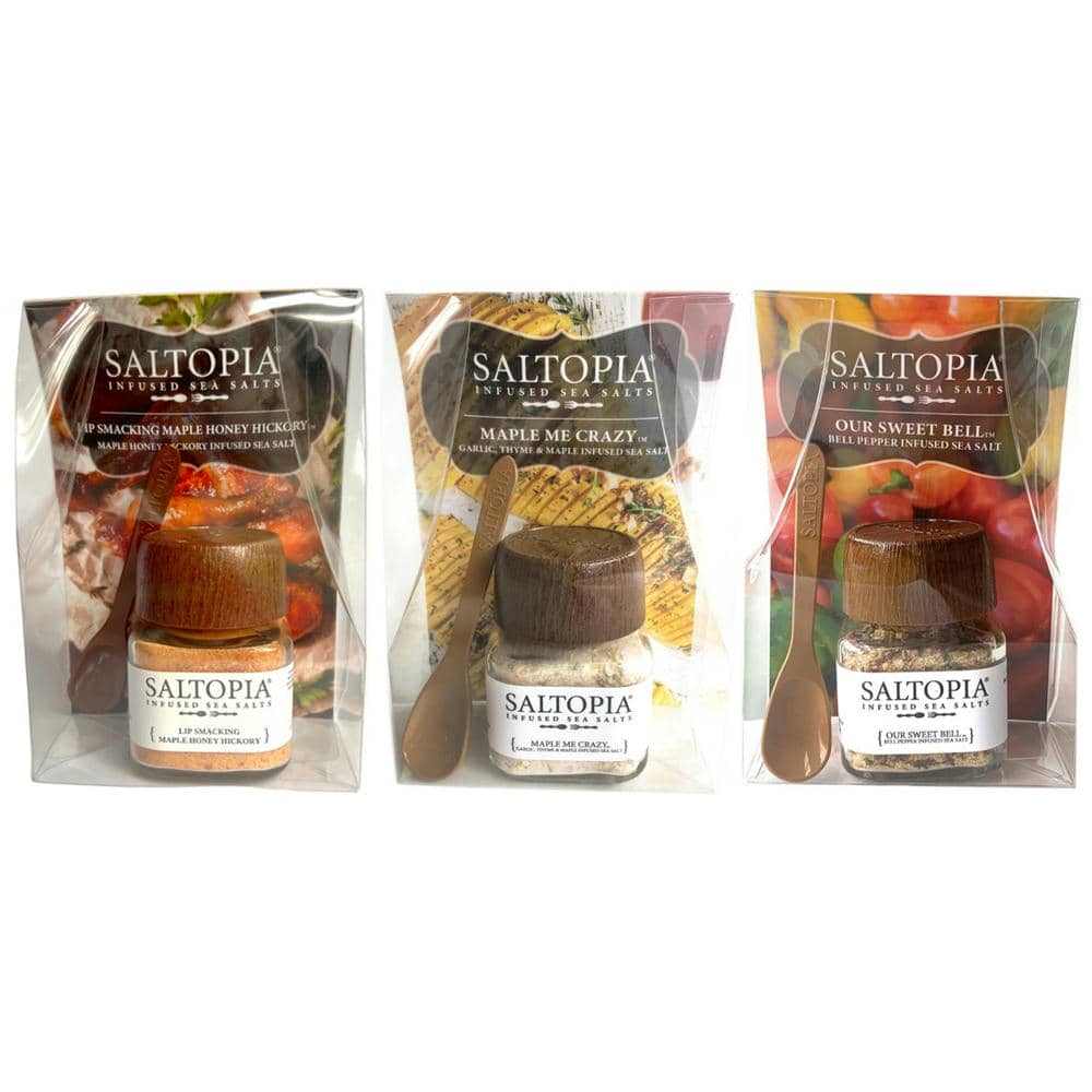 These delectable flavors cater to the satisfying combinations of sweet and salty, which create a more complex taste experience. This pairing activates different taste receptors simultaneously, increasing pleasure and cravings. The combinations in this trio gift set combine hickory and honey, maple and garlic, and sweet bell peppers. Each glass jar is beautifully packaged with its own recipe card and signature spoon for sprinkling. Either present the complete trio as a gift, or surprise three different recipients!