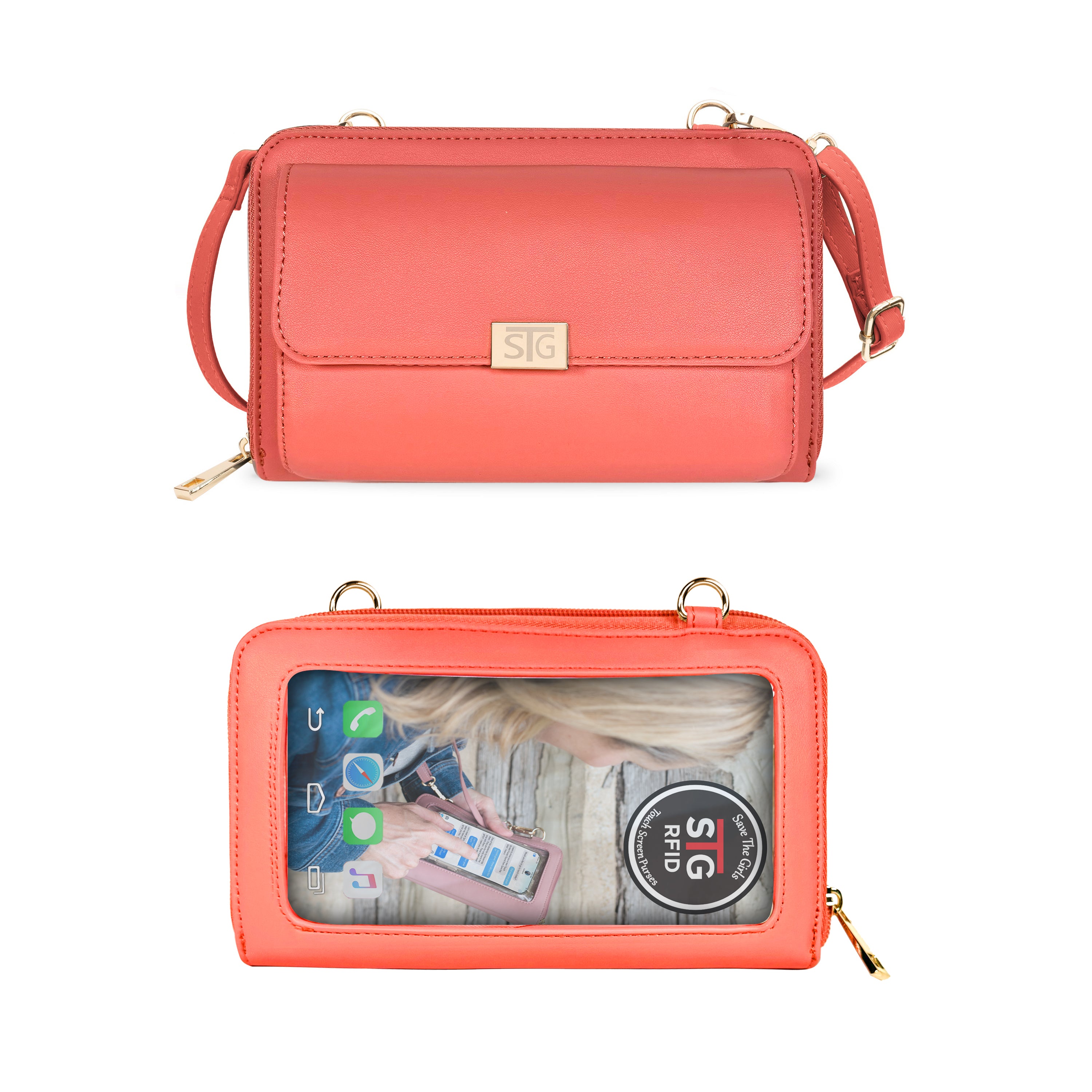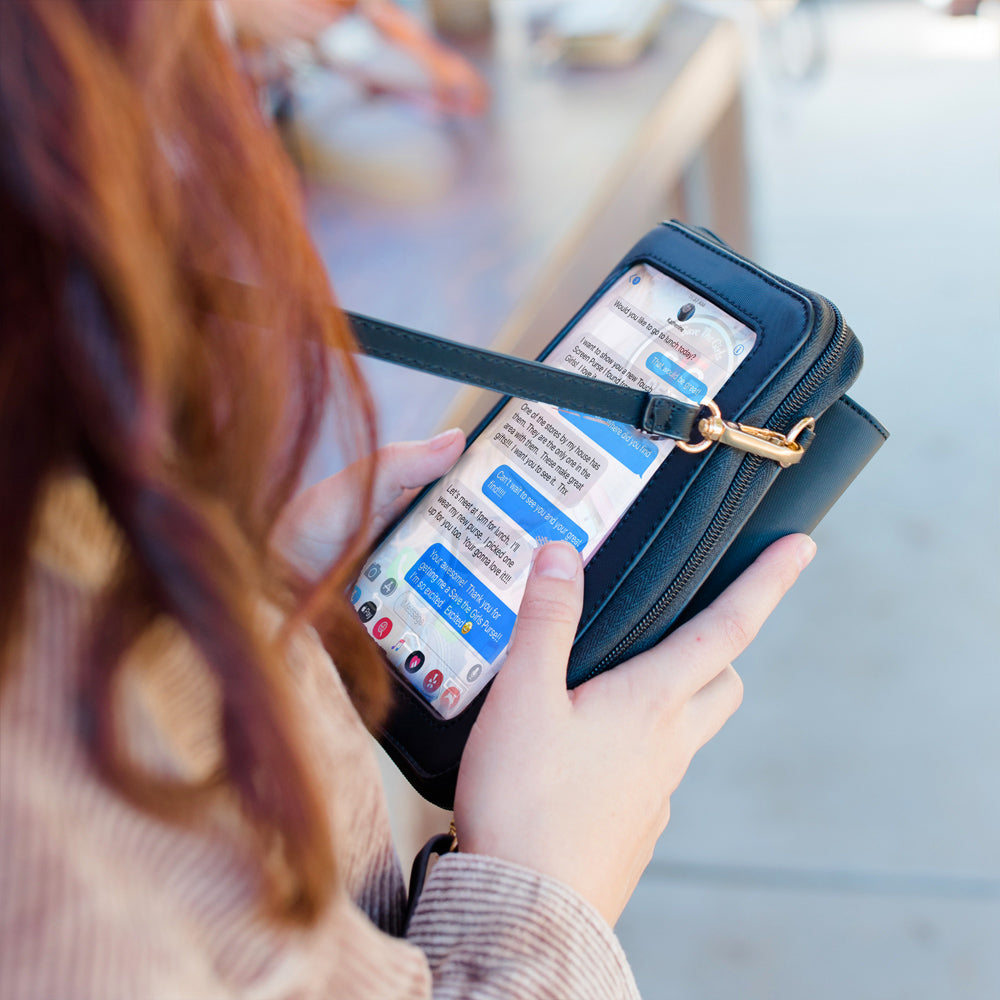 The Captiva Touch Screen Purse allows you to text, answer your phone, and perform other smartphone functions while your phone is safe and secure inside your purse. It combines functional design with elegant styling, featuring a roomy main compartment, change pocket, credit card slots, and front pocket for readers, sunglasses, and more!