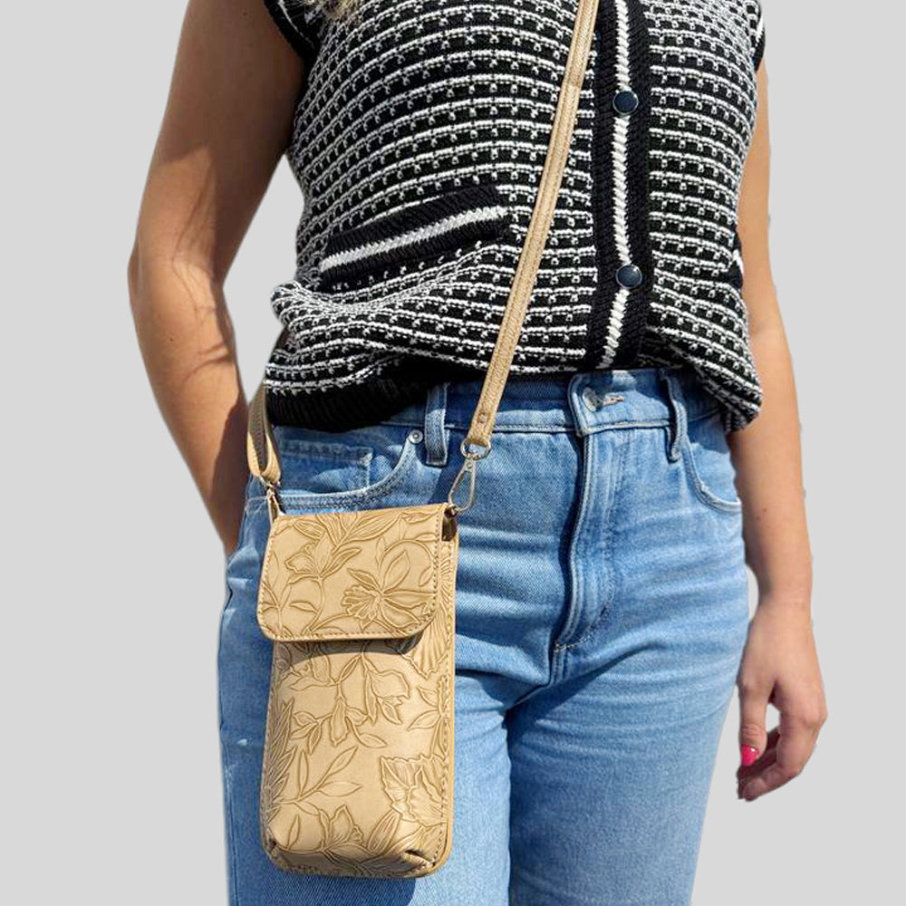 Experience the convenience of a Touch Screen Purse, simply by clipping the Floral Swing Along to your current purse, tote, or backpack. No purse, no problem—just clip it to your belt loop and go! Easily switch to the provided shoulder strap and turn your Swing Along into a crossbody purse, complete with three credit card slots and a hidden cash pocket.