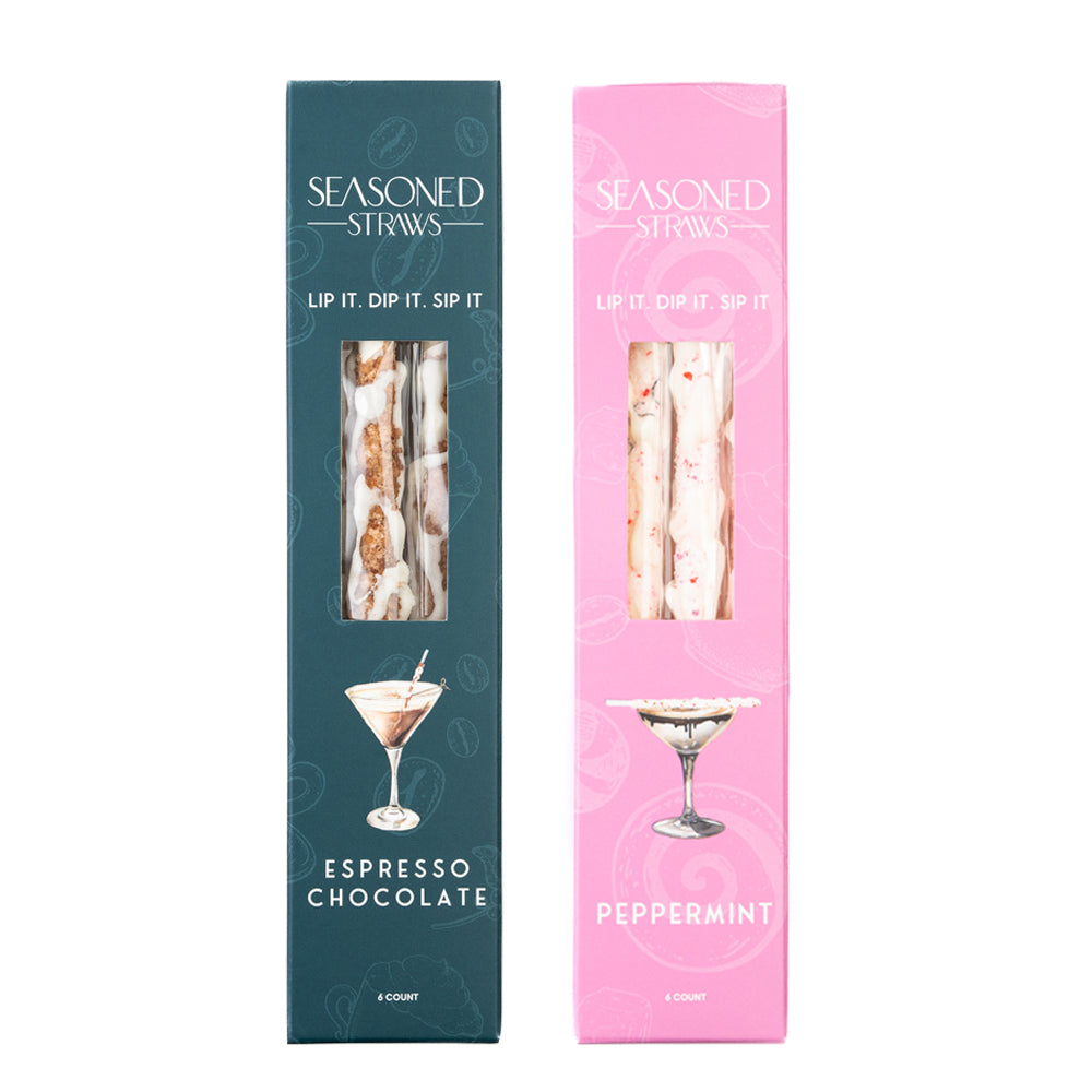 Sip in the spirit of the season with the Holiday Duo, a festive pairing of Peppermint and Espresso Chocolate Seasoned Straws. Whether you’re stirring a mug of cocoa, sweetening your espresso martini, or adding holiday flair to a White Russian, these handcrafted flavors make every sip merry and bright.