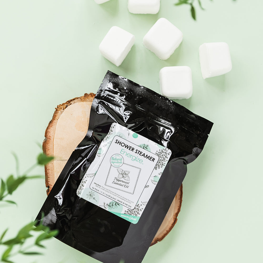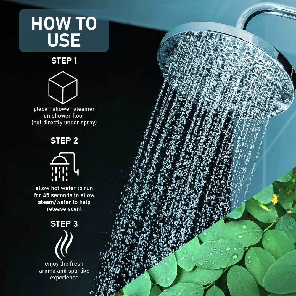 • Place one shower steamer on shower floor (not directly under spray, but enough it gets a bit wet). Water will activate to create a ‘burst’ of aroma