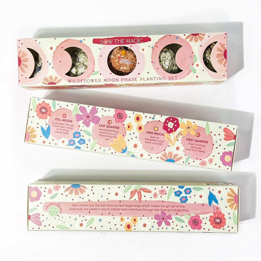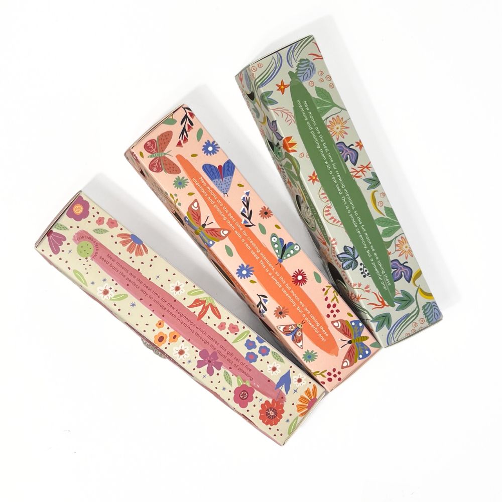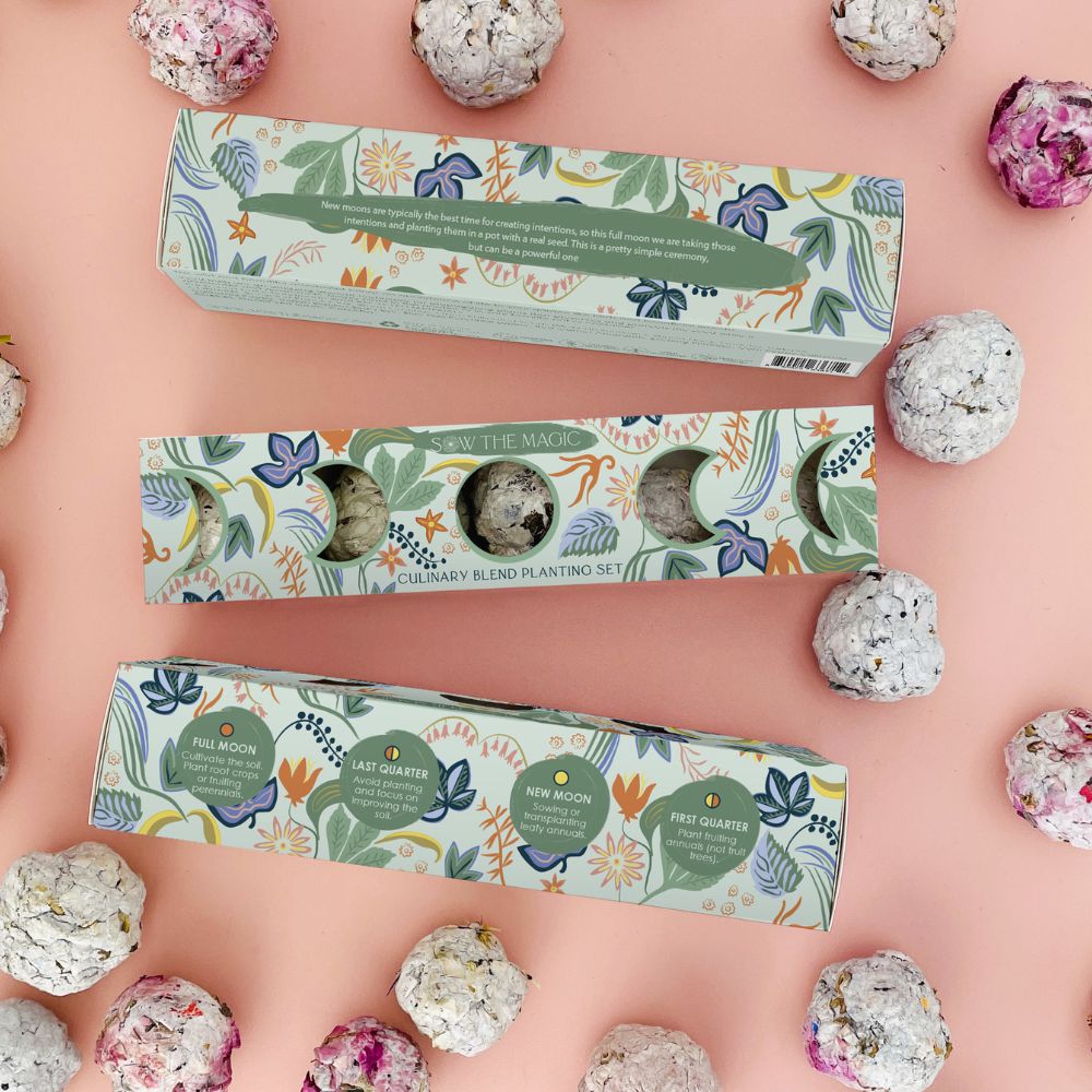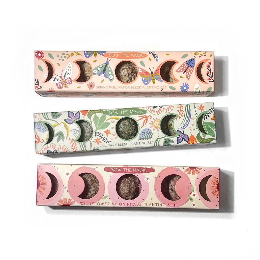 Align your garden with the magic of the moon. This trio of seed ball planting sets features a handpicked assortment of flowers and herbs, thoughtfully designed to harmonize your gardening practice with the natural rhythm of the lunar cycle. Each set brings intention, beauty, and a touch of ritual to your growing space, whether planted in pots or directly in the earth.