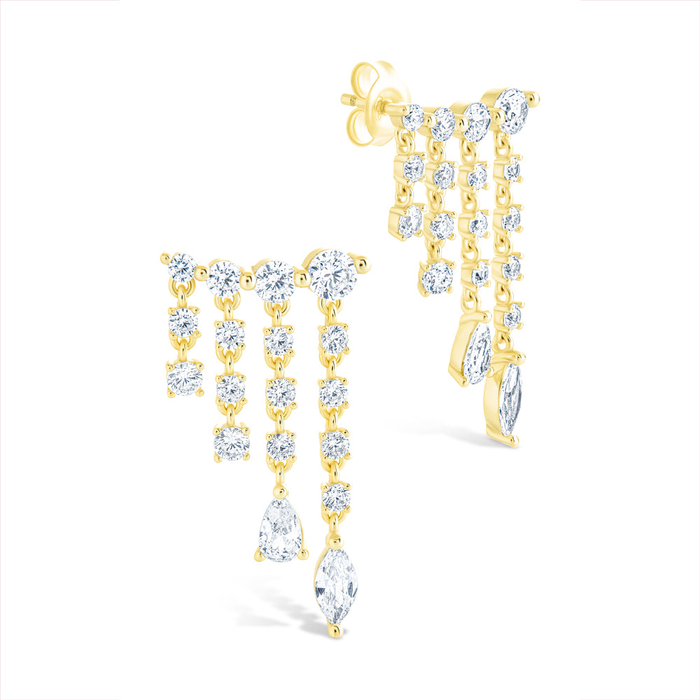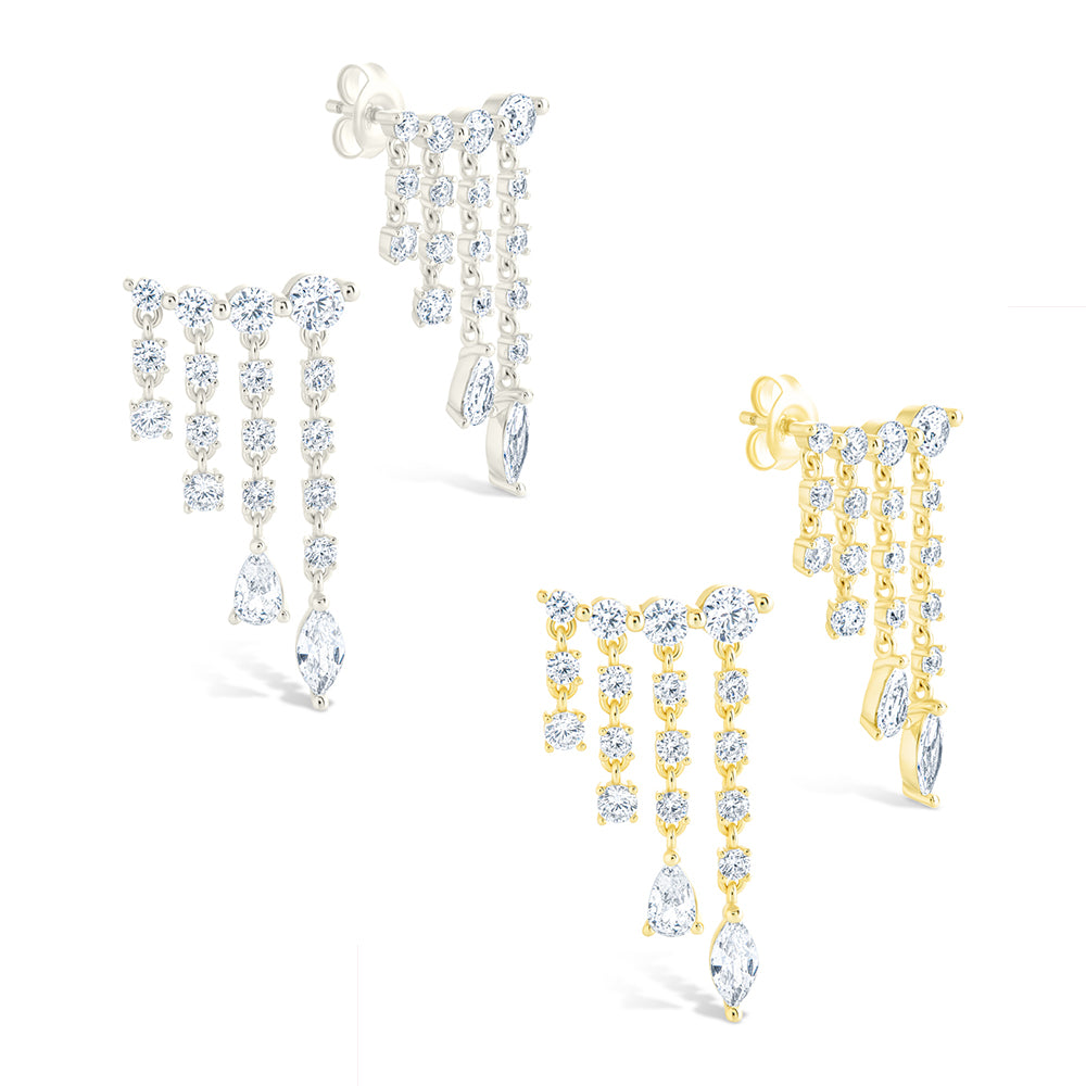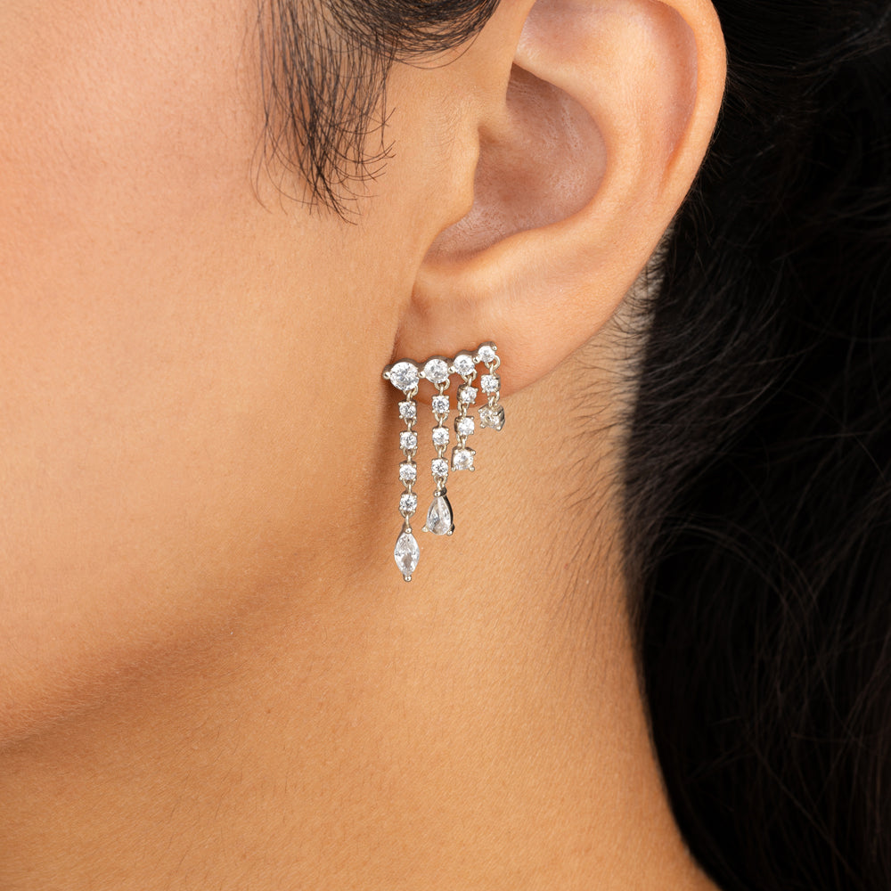 Elevate your style with the Sterling Silver Adrian CZ Waterfall Statement Studs. Designed with cascading rows of dazzling CZ stones, these dangle studs are the epitome of luxury. Make a statement and add a touch of elegance to any outfit.