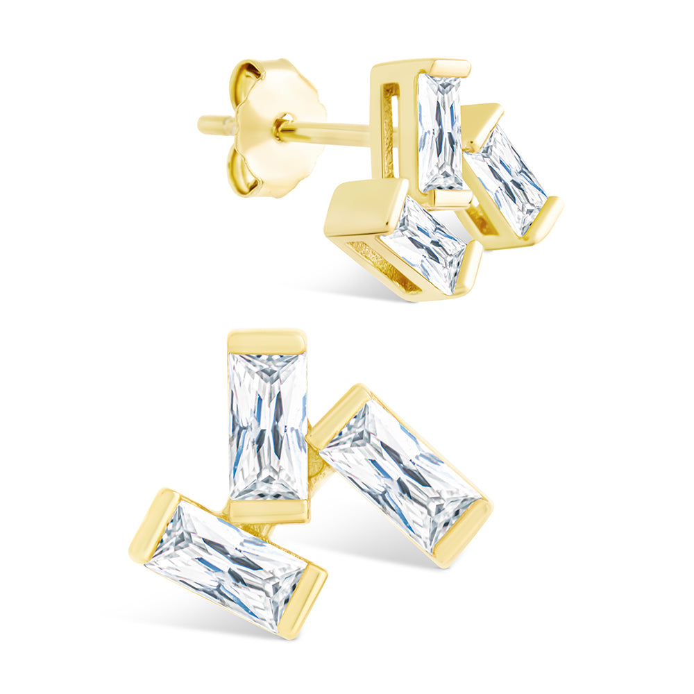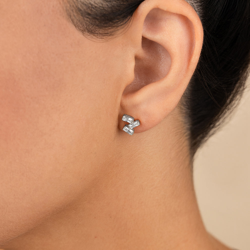 These earrings play with angles. The Macy Studs layer baguette cut, Hearts & Arrows stones into a sculptural trio. Sterling silver keeps the setting clean, while the angled cuts give a little extra lift.