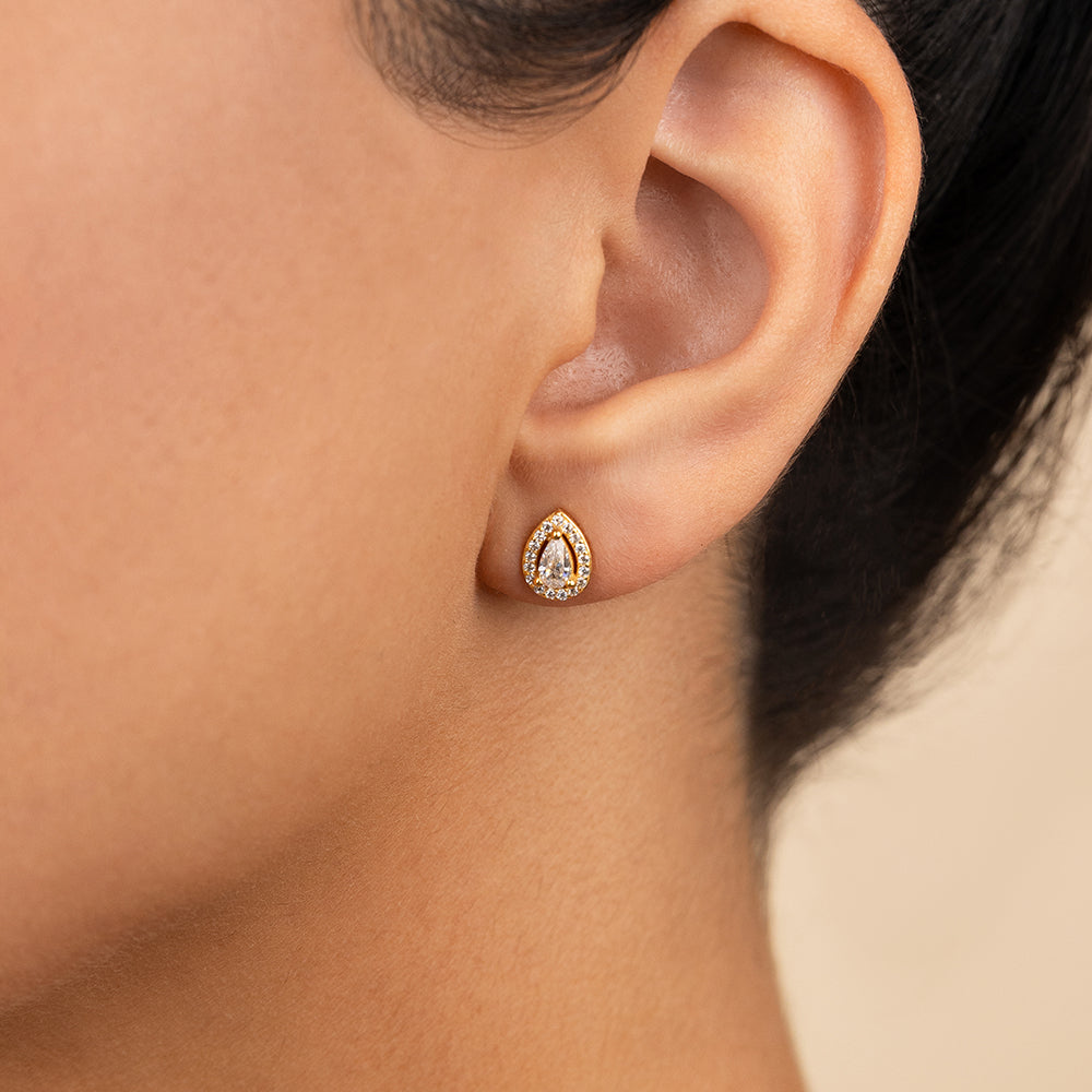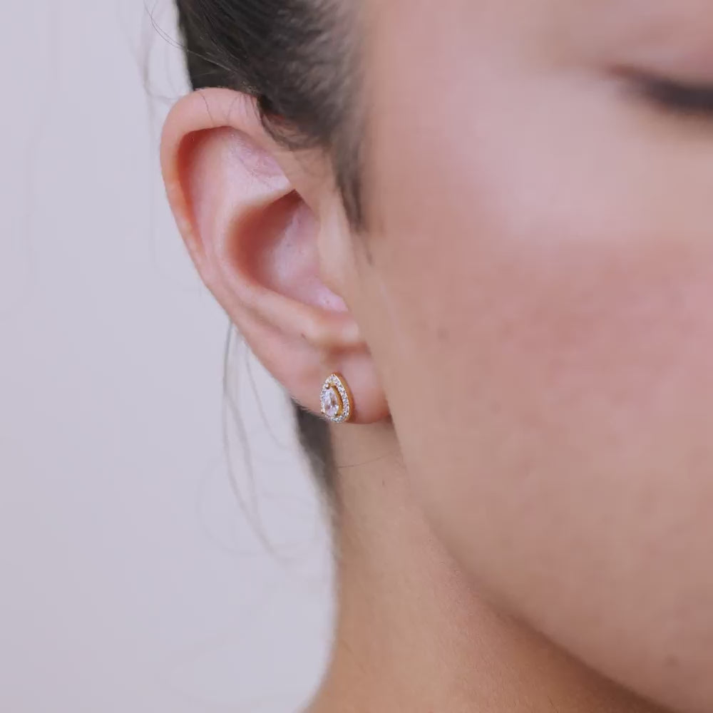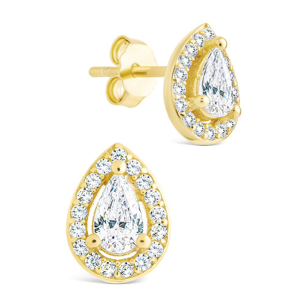 These brilliant earrings are a mix of elegance and edge. Made with Hearts & Arrows CZs, the pear-shaped center stone is surrounded by a delicate CZ halo. Simple enough for every day, but stunning enough to still make a statement.