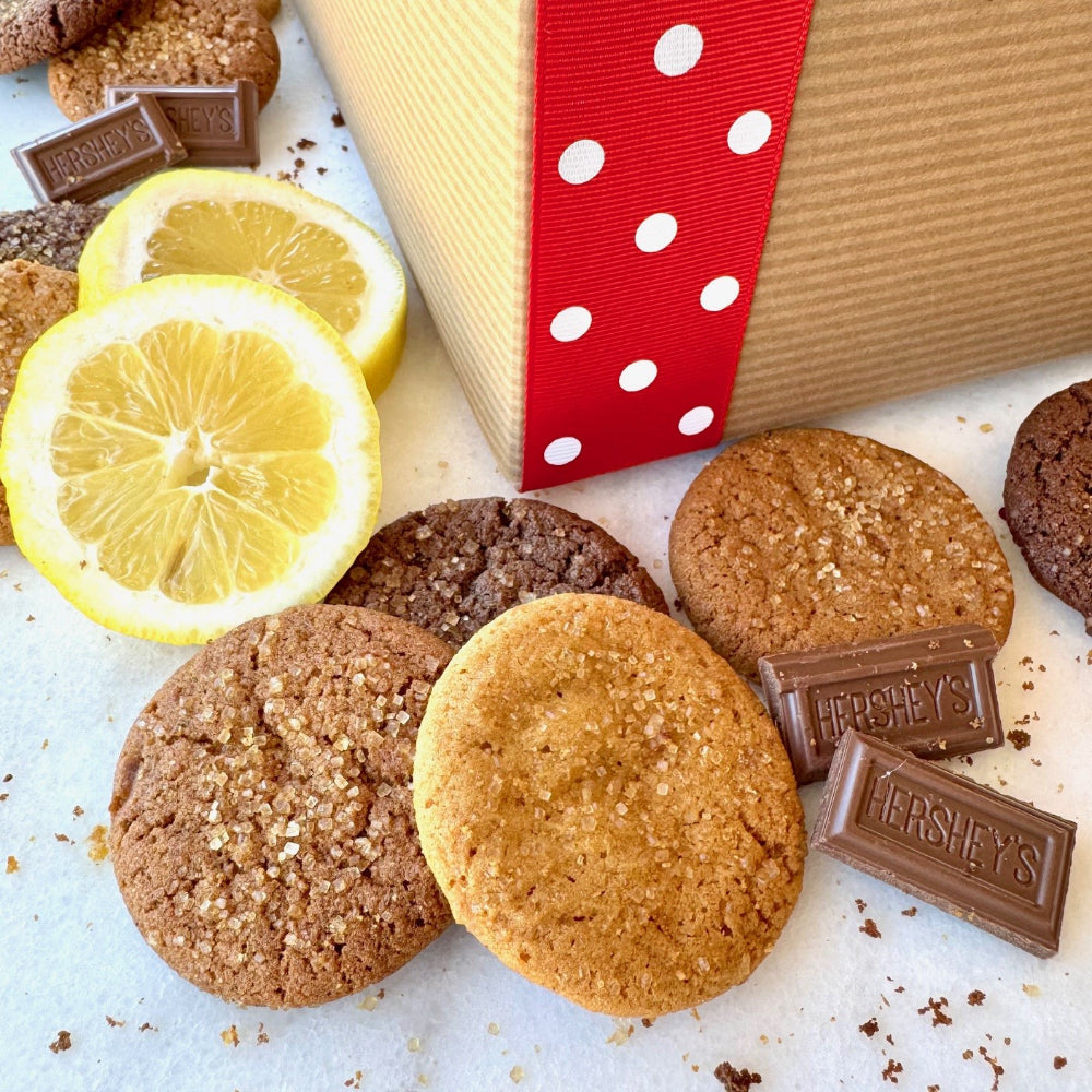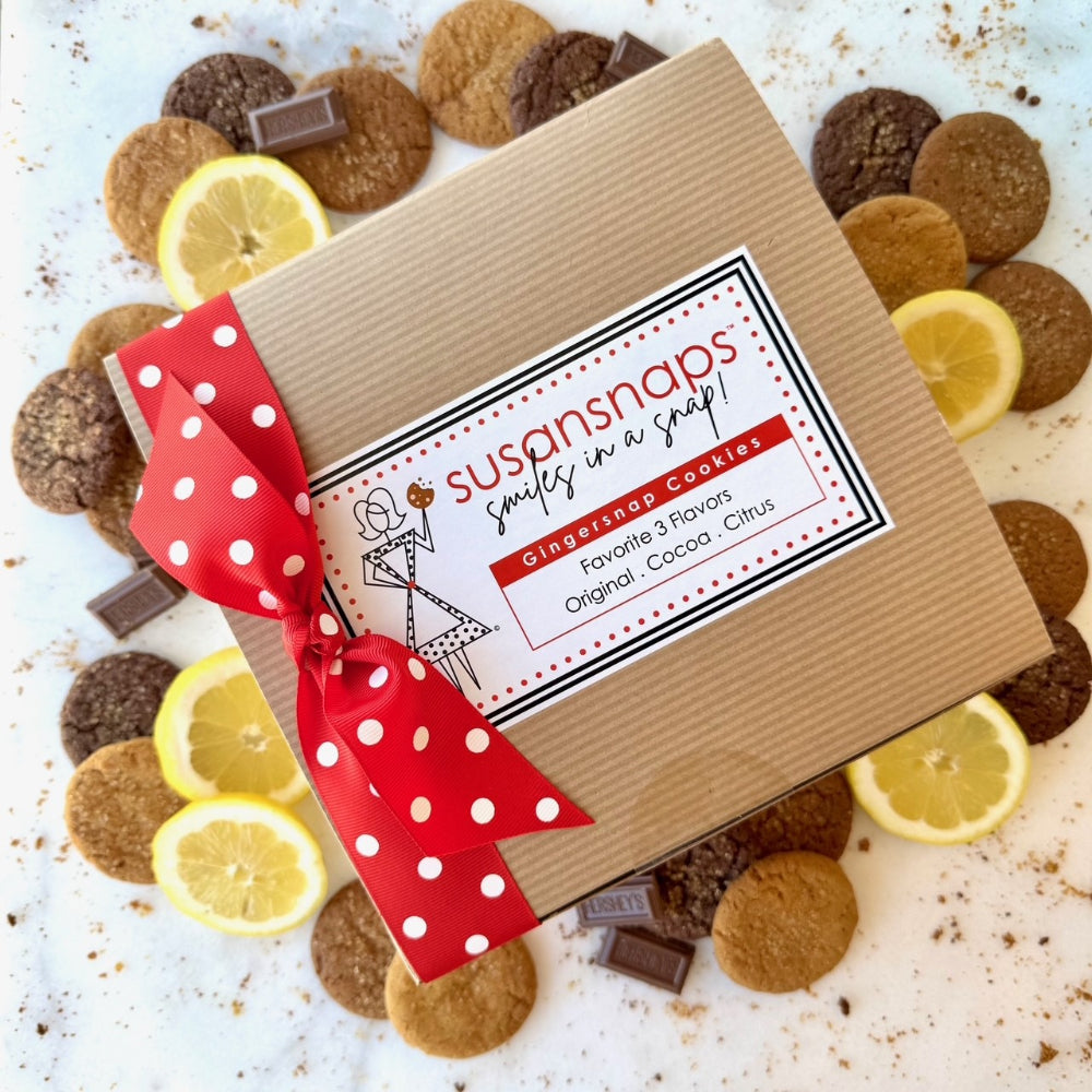 This irresistible assortment features three delicious flavors: classic Original gingersnaps, zesty Citrussnaps with a lemony tang, and decadent Cocoasnaps infused with real cocoa and pure vanilla. Whether as a personal treat or thoughtful gift, this variety box is the ultimate way to experience the bold, gourmet flavor of handcrafted gingersnap cookies.