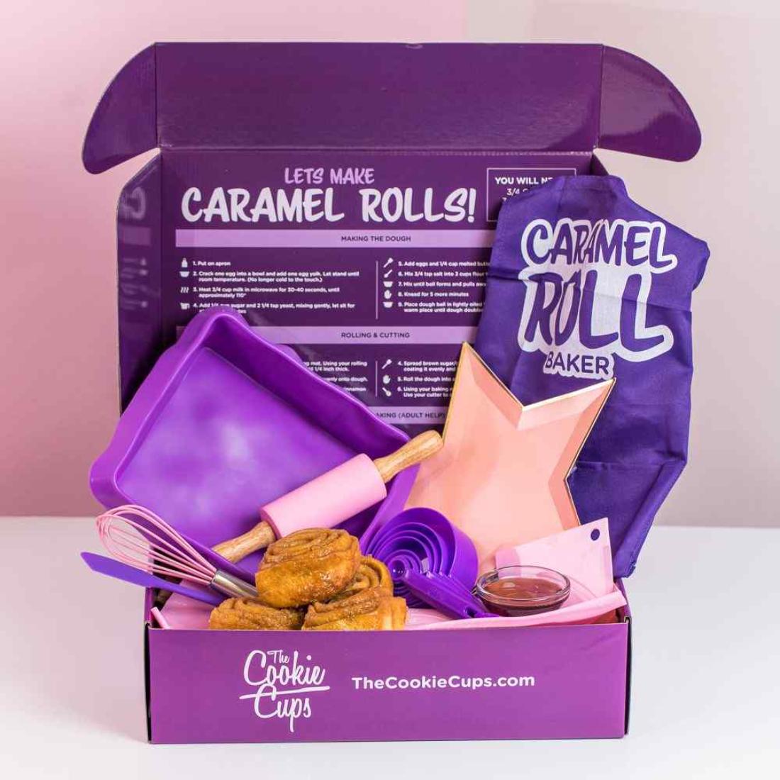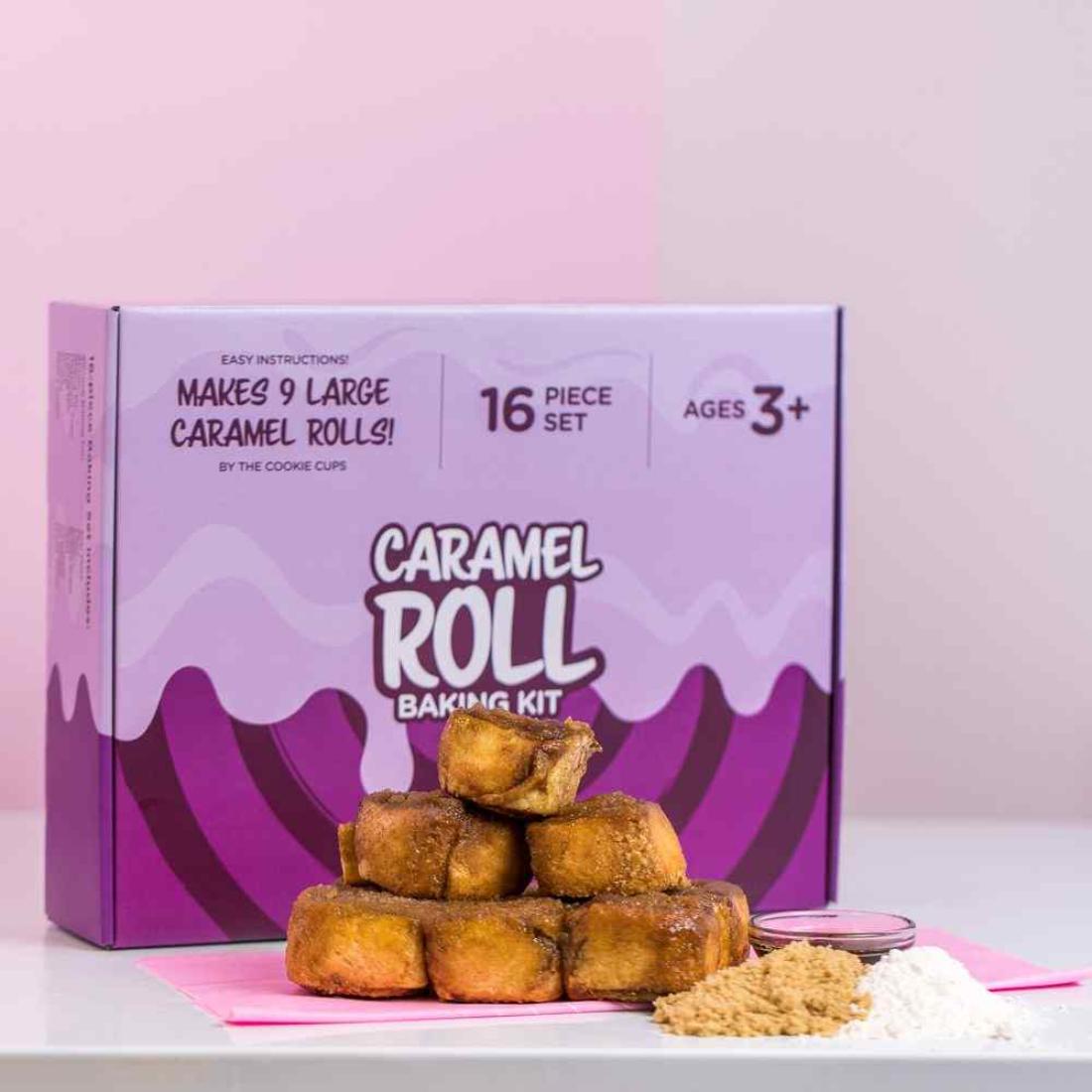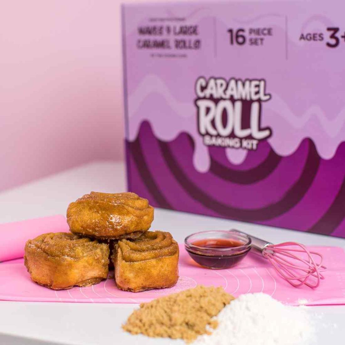A full at-home baking experience for kids! This complete kit is designed for you to make nine large caramel rolls from scratch, including making your own dough and filling. You’ll have enough to feed the whole family!