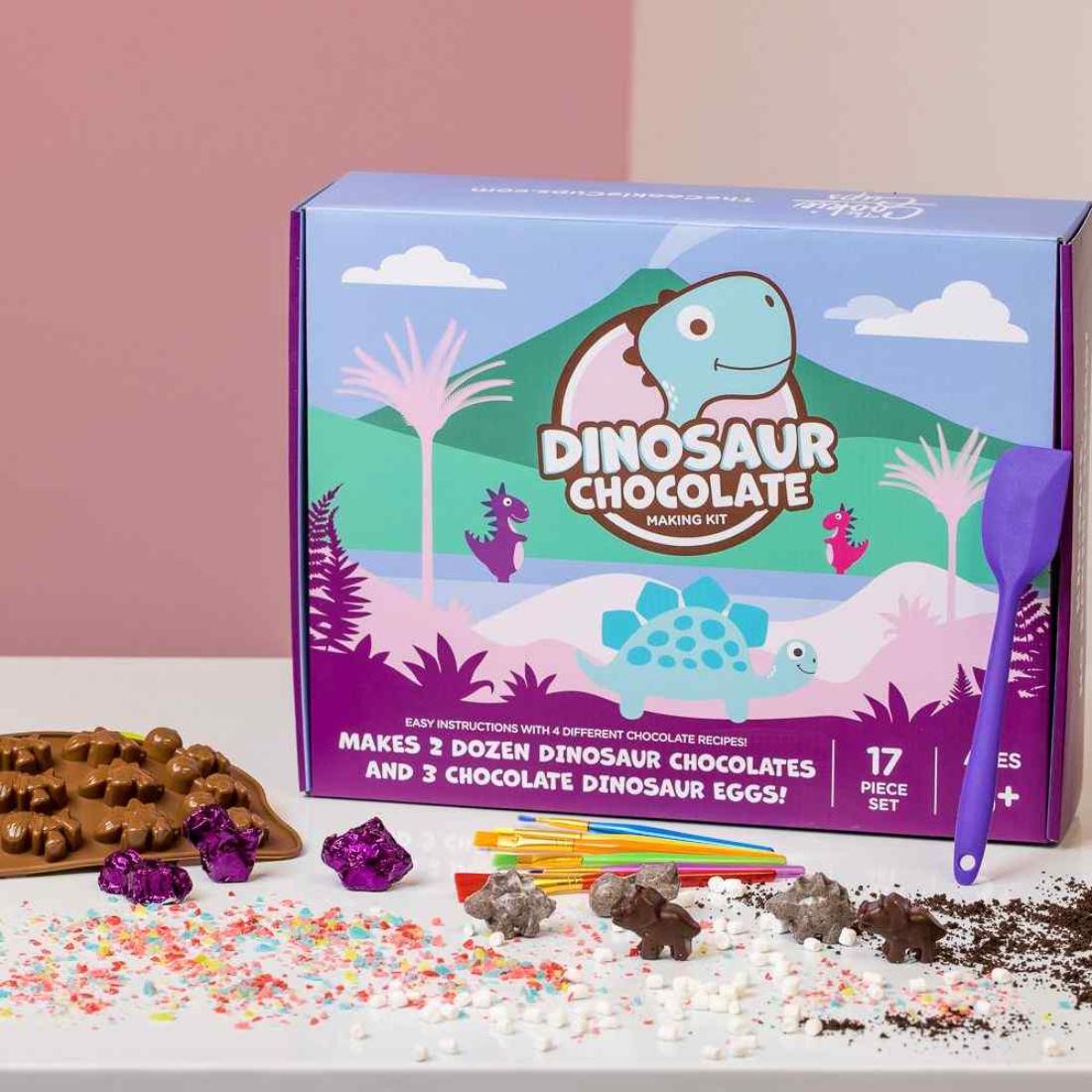 A full at-home baking experience for kids! This complete kit is designed for you to make two dozen dinosaur-shaped chocolates and three large chocolate dinosaur eggs from scratch. Get ready for a dino-mite time!