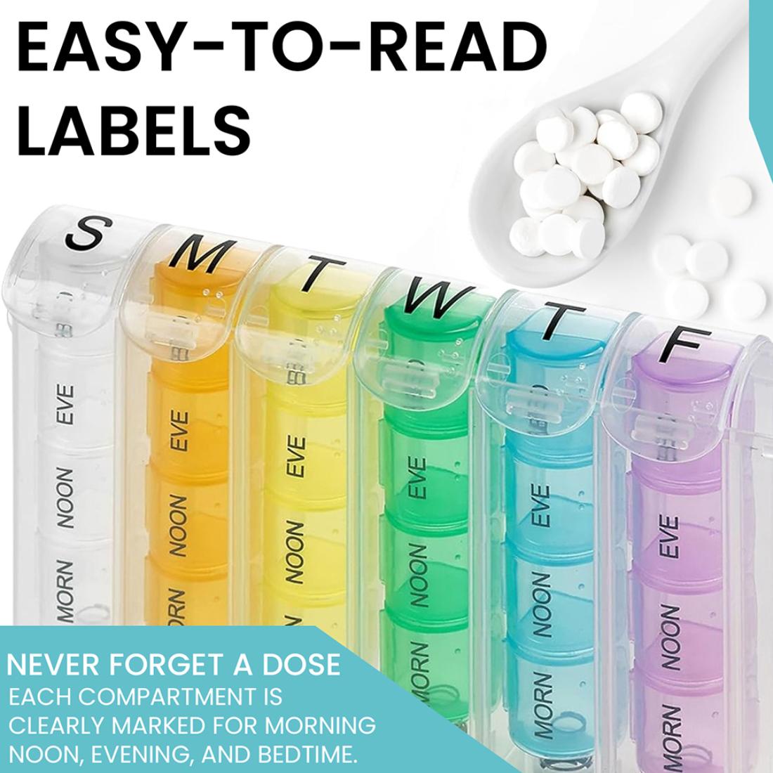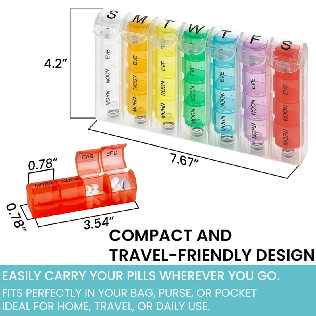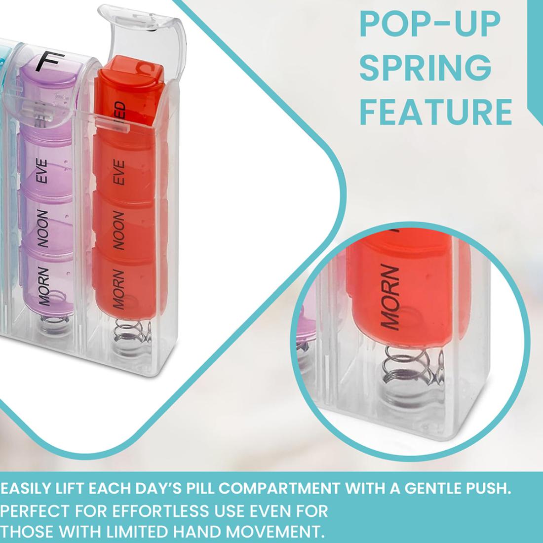 Managing daily medications is easier with this pop-up weekly pill organizer, thoughtfully designed to support consistent and accurate dosing. Each day is divided into four clearly labeled compartments, allowing you to separate morning, noon, evening, and nighttime medications.