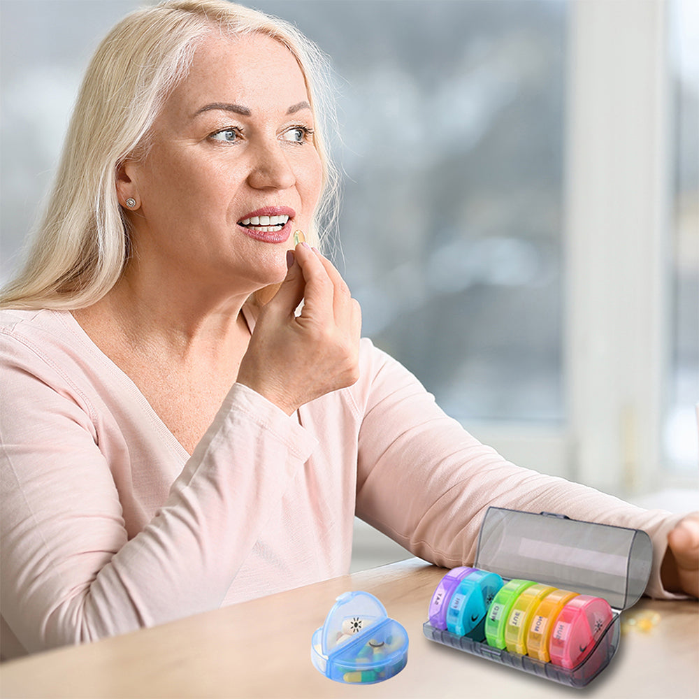 Keep your pills and vitamins organized and protected with seven colorful, labeled compartments.